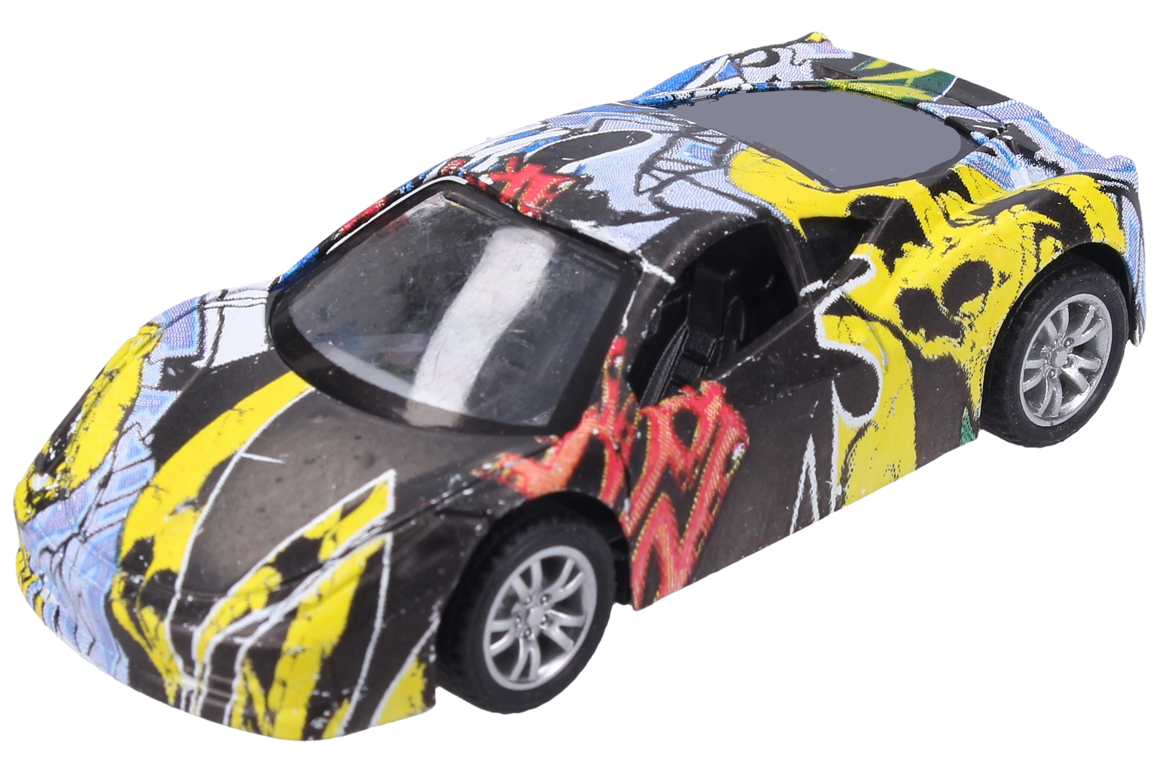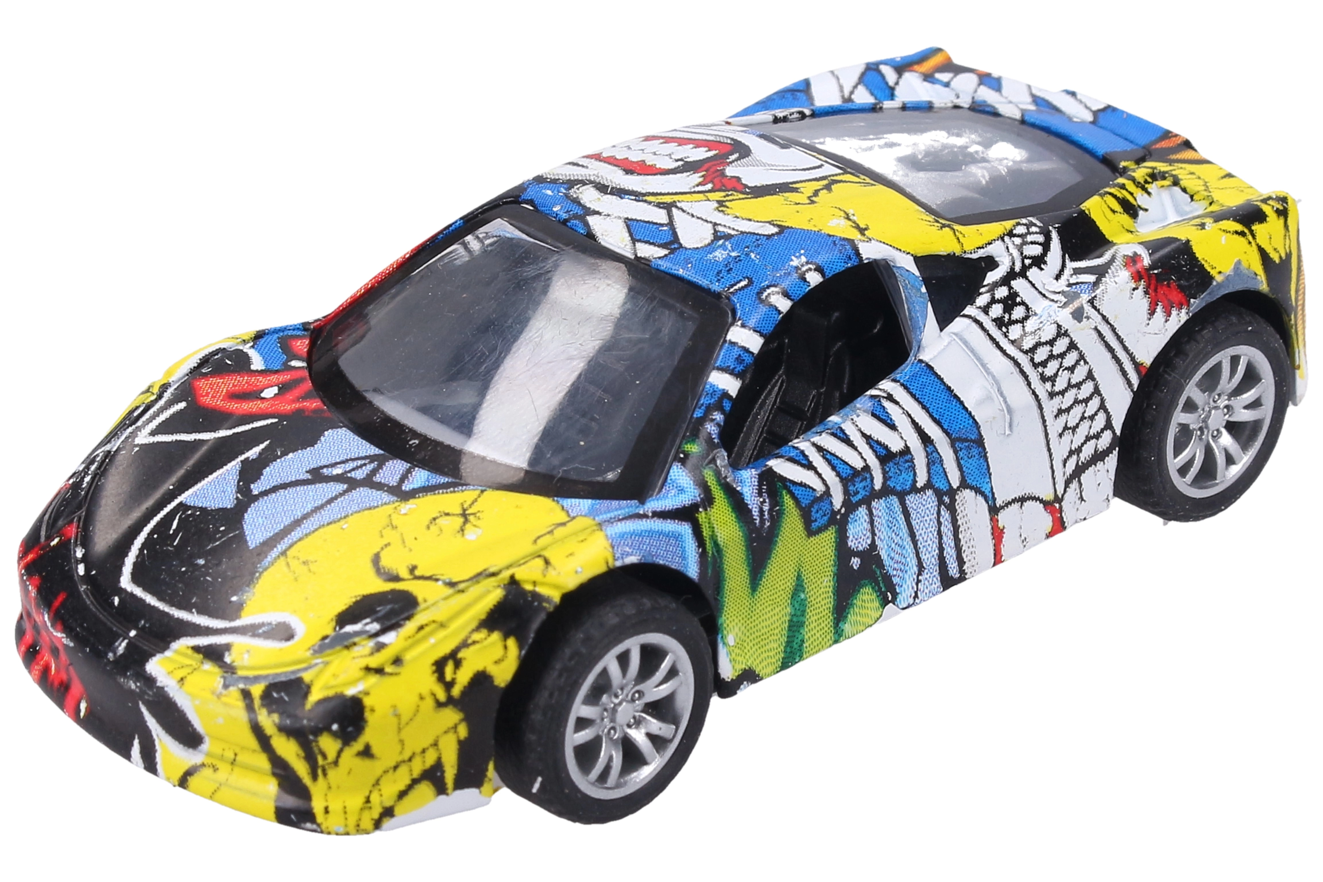 Stilīgs metāla auto ar oriģinālu grafiti dizainu iepriecinās gan mazos, gan lielos kolekcionārus. Kompakts izmērs 9 cm, atvilkšanas piedziņa un 3 dažādas versijas padara to par lielisku izvēli gan izklaidei, gan kolekcijai.