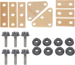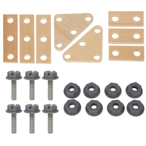 - Rati–darbnīca; plakanais skrūvgriezis; āmurs; atslēga (plakanais/gredzenatslēga); skava; plāksnītes ar caurumiem × 8; skrūve × 8; uzgrieznis × 8; liels nags × 2; formas šķirotājam (kvadrāts, trīsstūris, aplis); montāžas komplekts; brūna transporta kaste