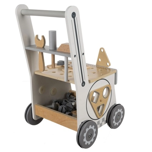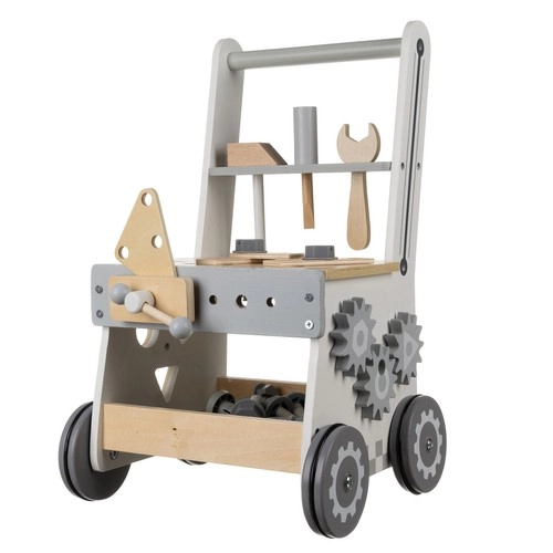 Viens produkts, trīs lietošanas veidi. Bērni var skrūvēt, stumt ratus pirmajos soļos un glabāt instrumentus un detaļas pārskatāmās nodalījumos.