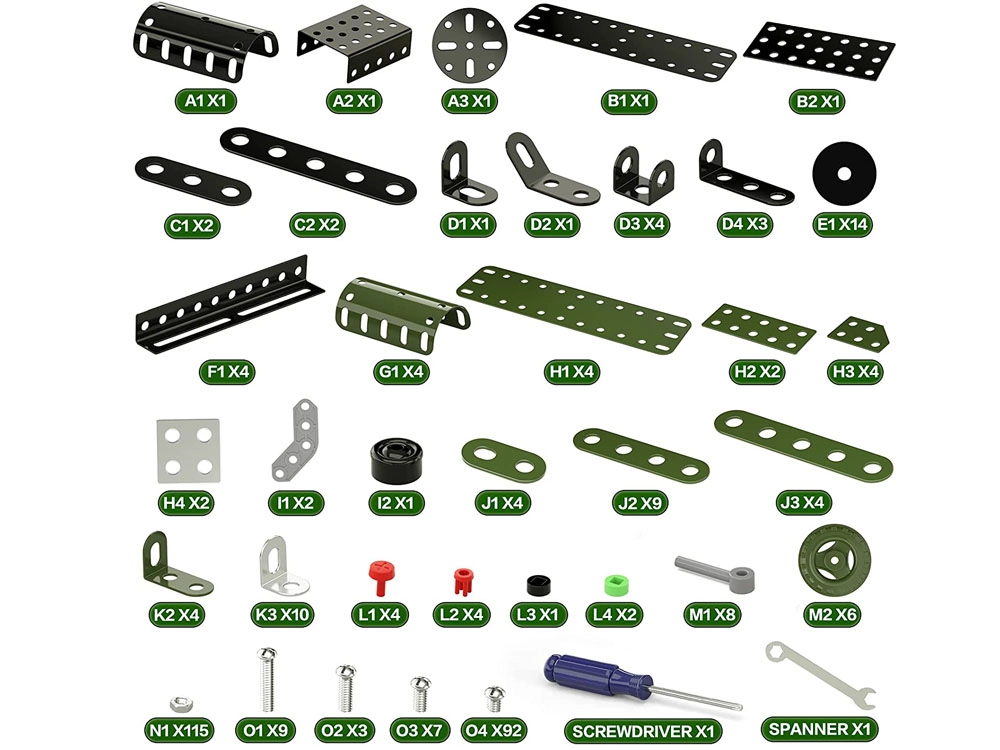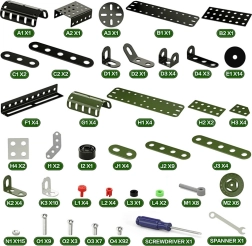 Iepakojumā atradīsiet visu nepieciešamo modeļa salikšanai, tostarp metāla un plastmasas detaļas, instrumentus un uzlīmes.