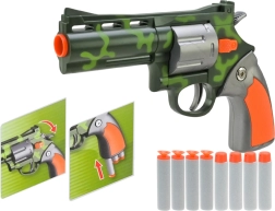 Komplektā ietilpst kompakta pistole ar kamuflāžas rakstu, kuru ērti turēt vienā rokā. No putām un mīkstas gumijas izgatavotie lodiņi nodrošina maksimālu drošību un vieglumu. Komplektā iekļauti 6 lodiņi.