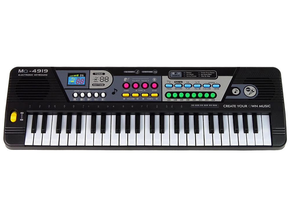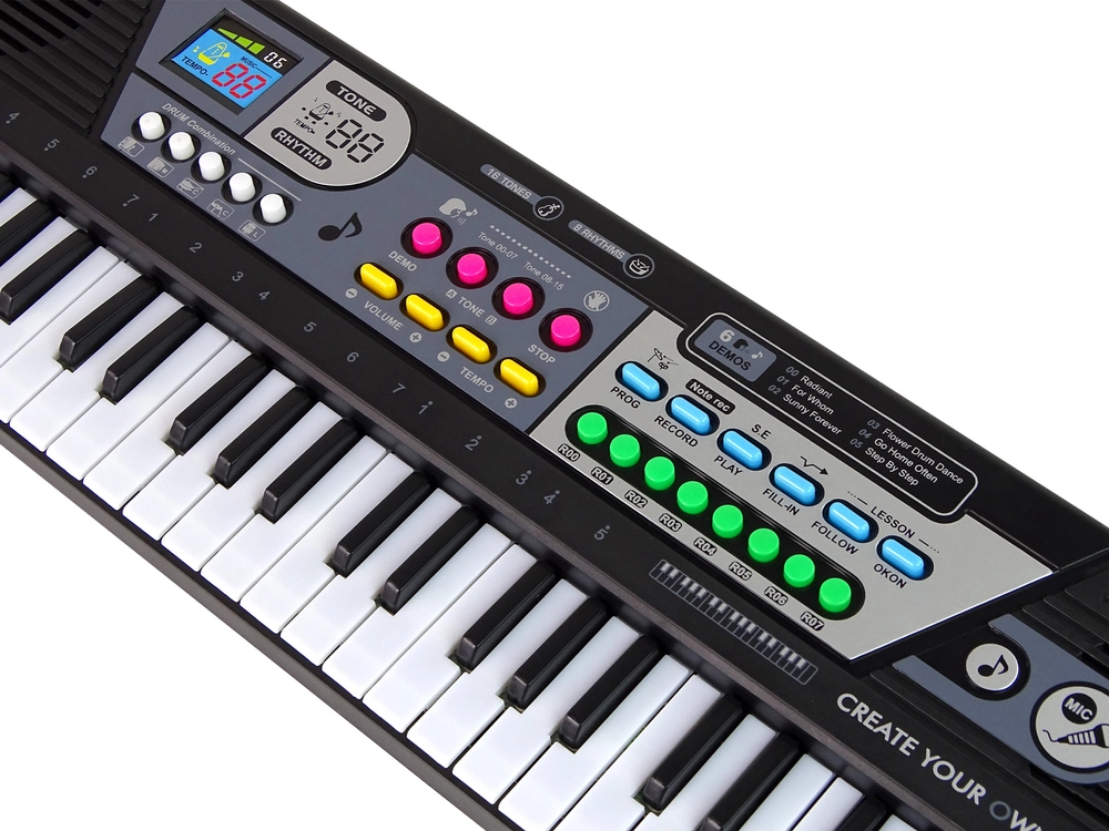Attīstiet sava bērna muzikālo talantu ar šo kompakto klaviatūru ar 49 taustiņiem un mikrofonu. Viegla vadība, 6 demo skaņdarbi, 16 tembri, 8 ritmi, perkusiju skaņas, 2 mācību režīmi, ierakstīšana, skaļuma un tempa regulēšana. Viegls korpuss un ieeja iecienīto dziesmu atskaņošanai nodrošina stundām ilgu izklaidi.