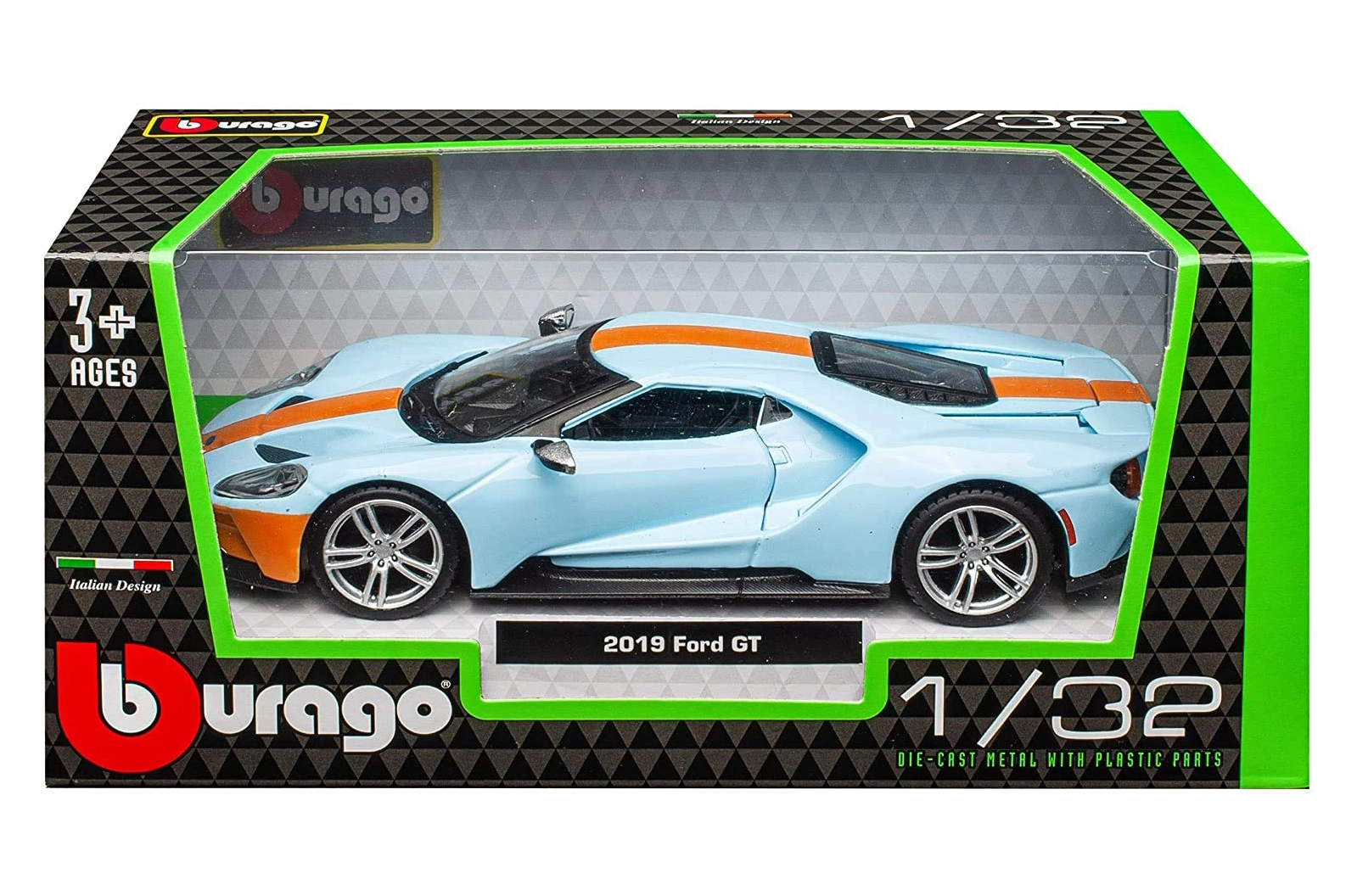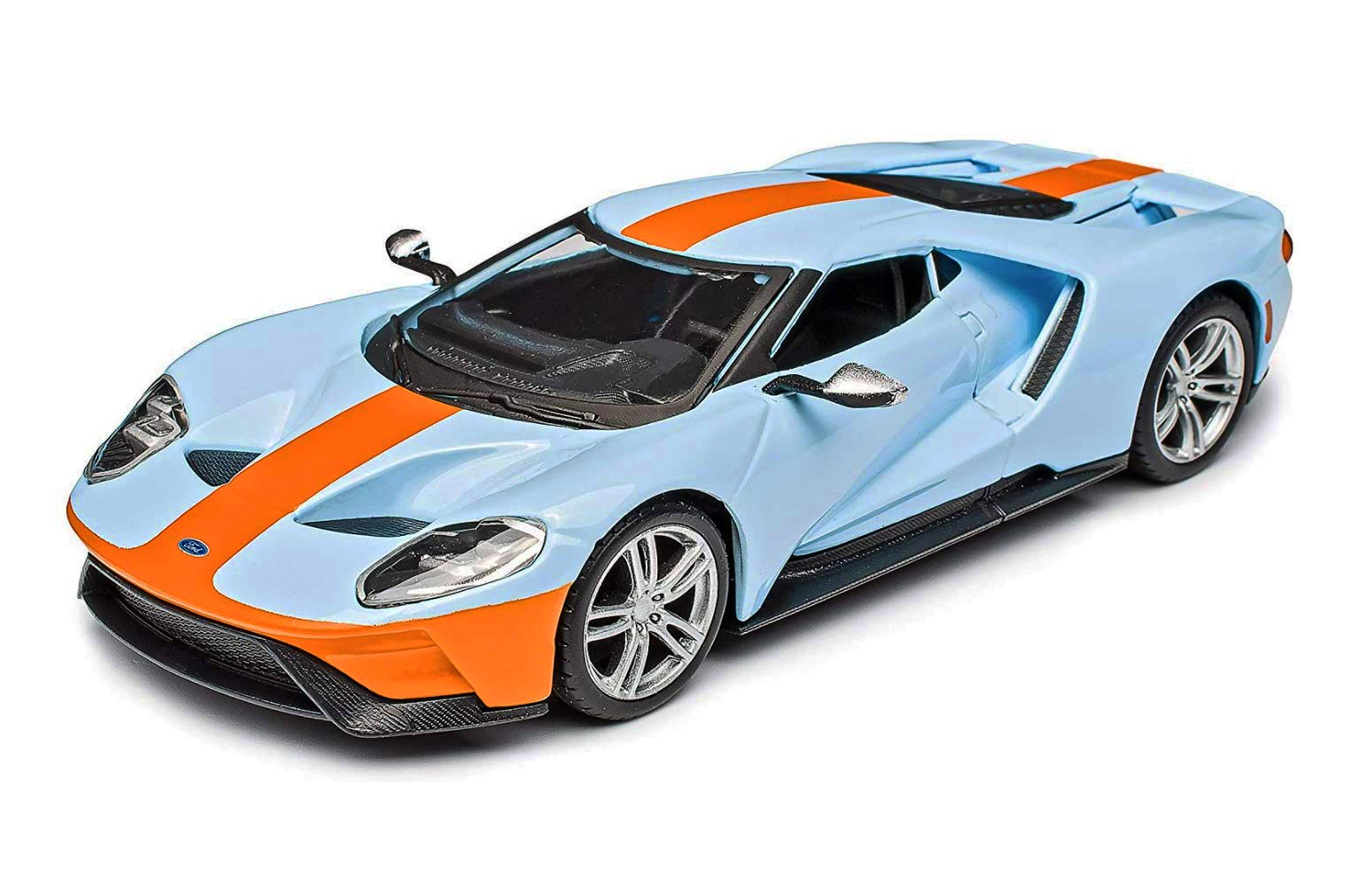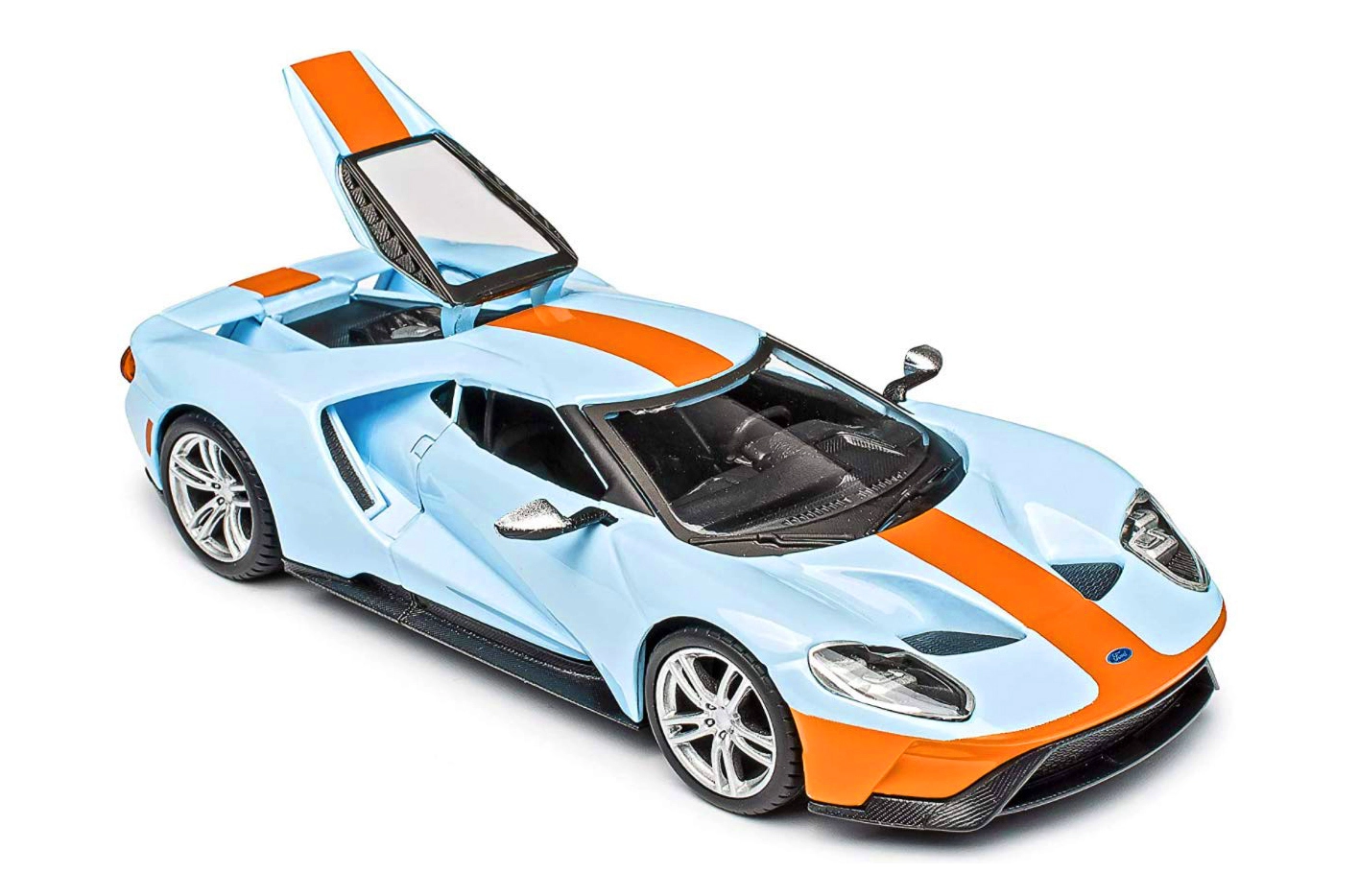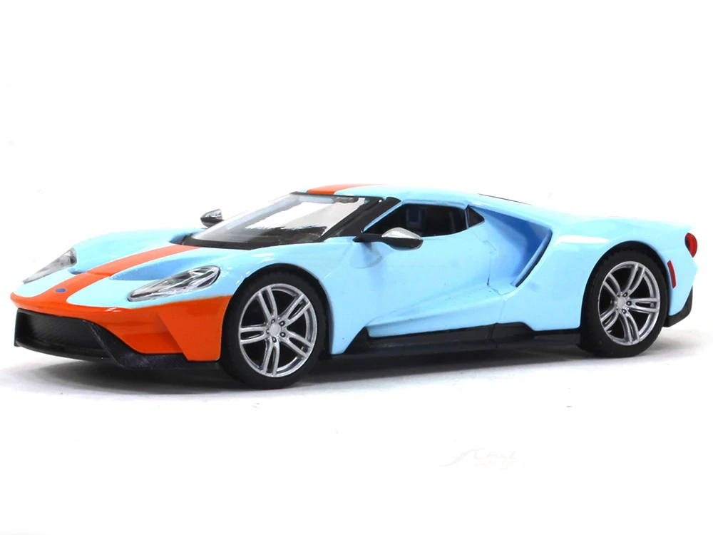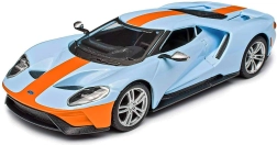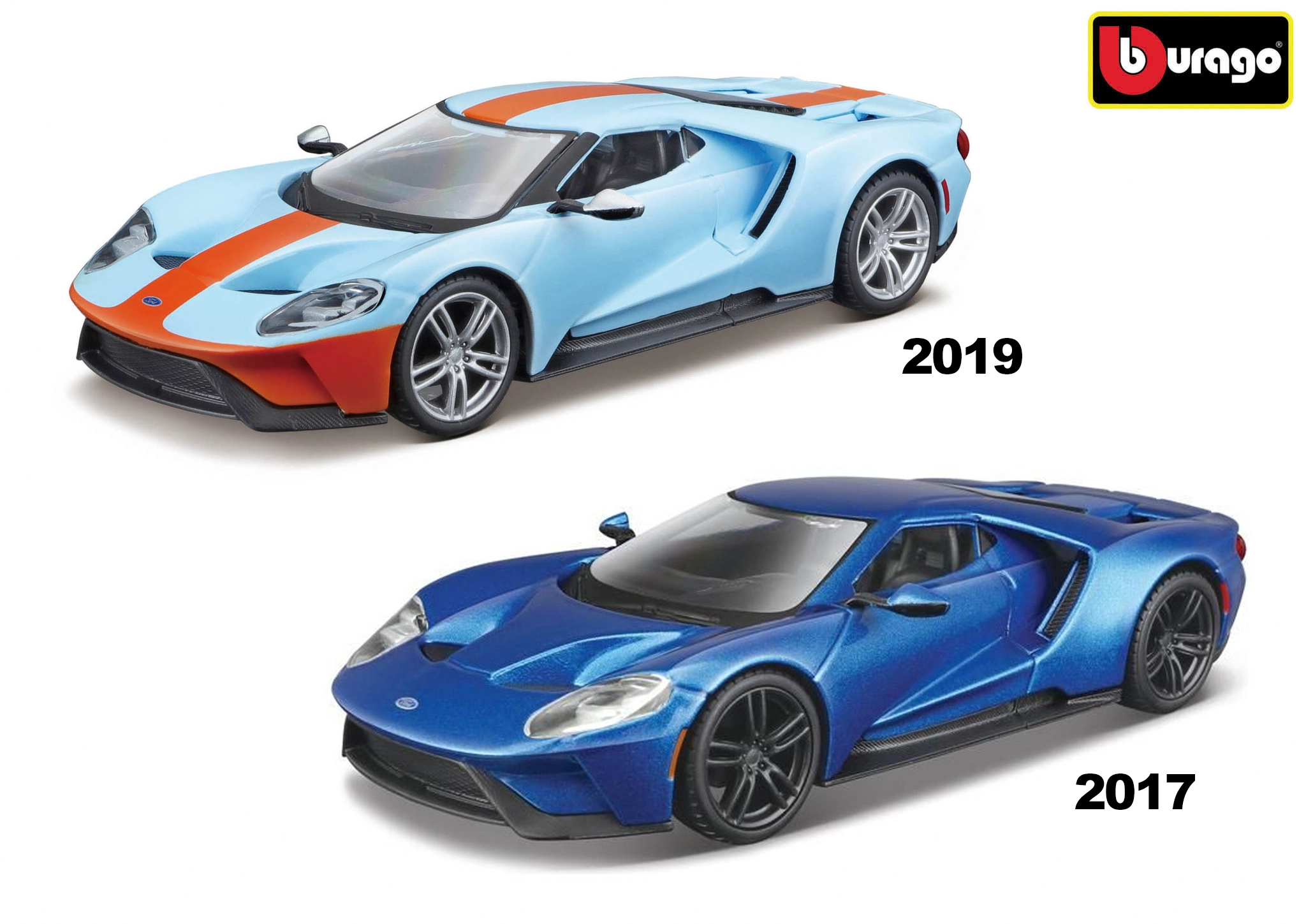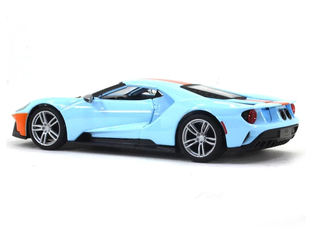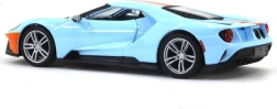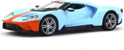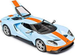Šis licencētais FORD GT 2017 modelis pievilcīgā zilā metālikā ar kontrastējošām oranžām svītrām uzticami ataino oriģināla aerodinamiskās līnijas. Pateicoties lietā metāla (die-cast) un kvalitatīvu plastmasas detaļu apvienojumam, tas piedāvā reālistisku izskatu un patīkamu svaru rokā.
