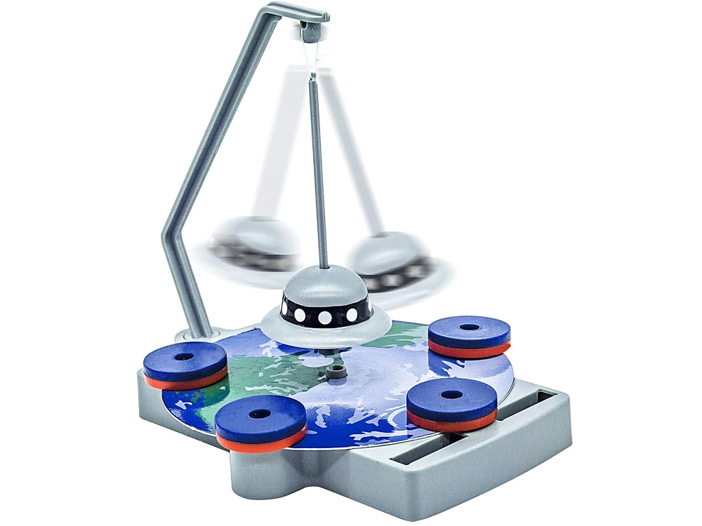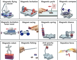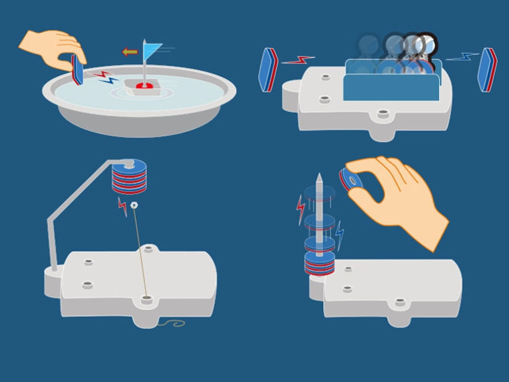 Saliekams ratiņš, rotējoši diski un citas mehāniskas sastāvdaļas parāda magnētisko spēku kustībā un motivē turpināt eksperimentus.