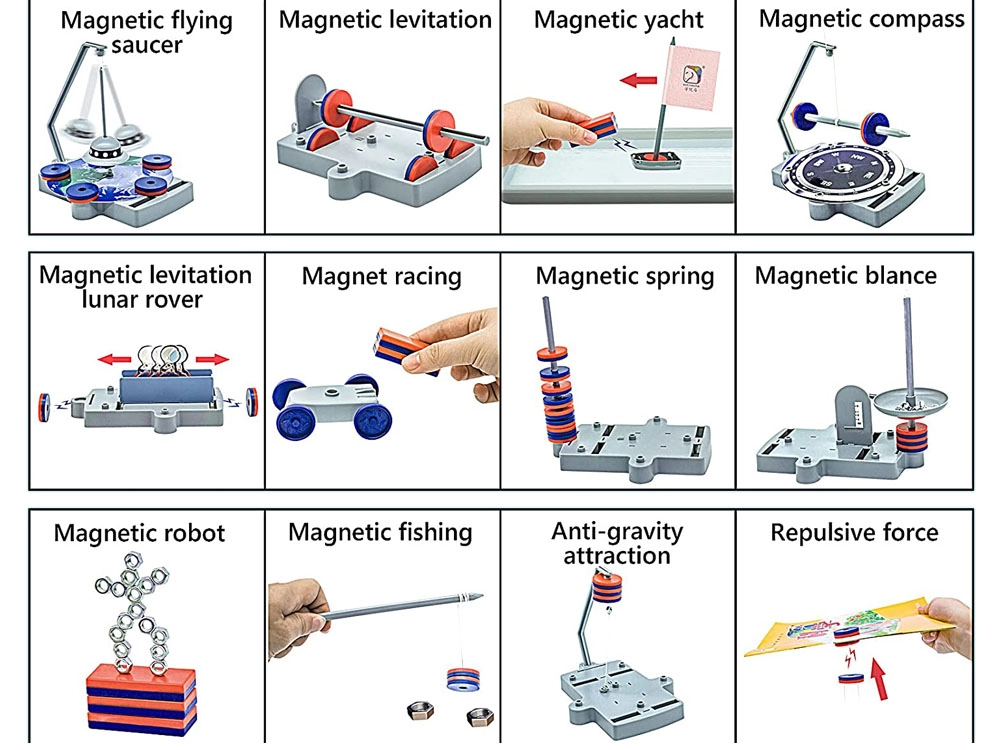 Iepakojumā ietilpst krāsaini magnēti, plastmasas pamatnes un piederumi, ar kuriem var izveidot tematiskiem projektiem – piemēram, svārsta UFO, magnētisko ratiņu vai figūru no metāla uzgriežņiem. Pateicoties pārskatāmajām detaļām, salikšana ir vienkārša un droša, ideāli piemērota mājmācībai un skolas pulciņiem.