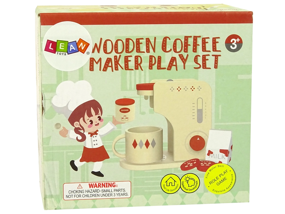 Mīlīgais koka kafijas automāts bērniem ienes katrā bērnu virtuvē reālistisku “gatavošanas” spēli. Komplektā ir kafijas automāts ar grozāmu pogu, krūzīte, piens, cukurs un 3 kafijas kapsulas bezgalīgām kafejnīcas ainām. Izturīgā koka konstrukcija veicina sīko motoriku, radošumu un sociālās prasmes drošā un jautrā spēlē.