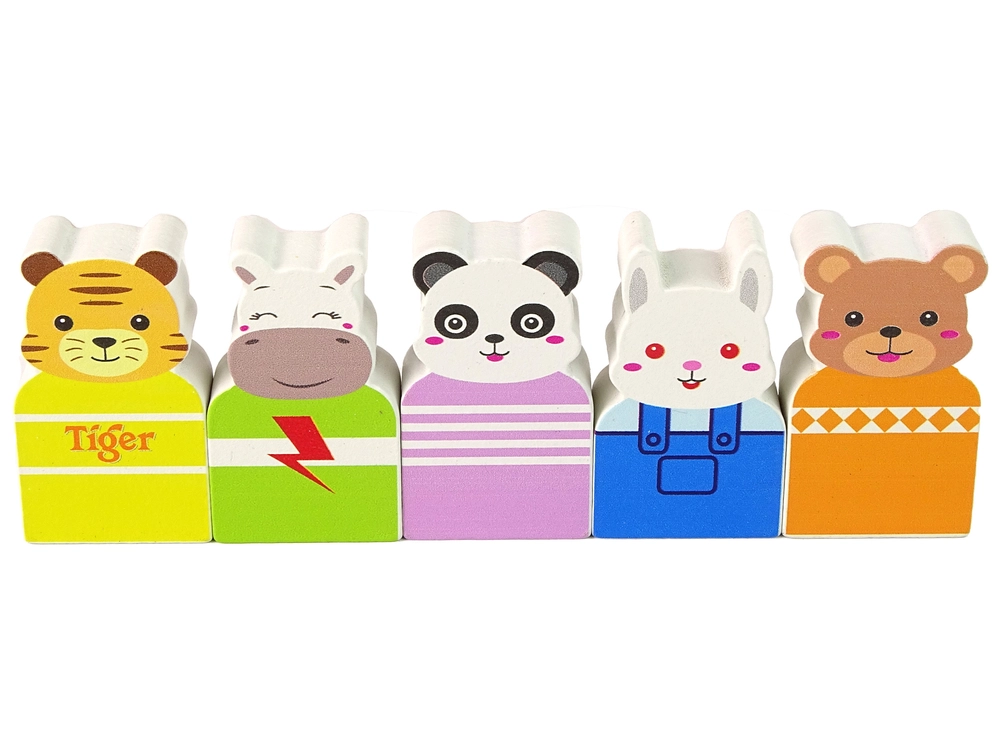 Piecas figūriņas (panda, tīģeris, trusis, lācis, nīlzirgs) un cipari uz gondolām rotaļīgā veidā veicina krāsu un pirmo skaitļu apgūšanu.