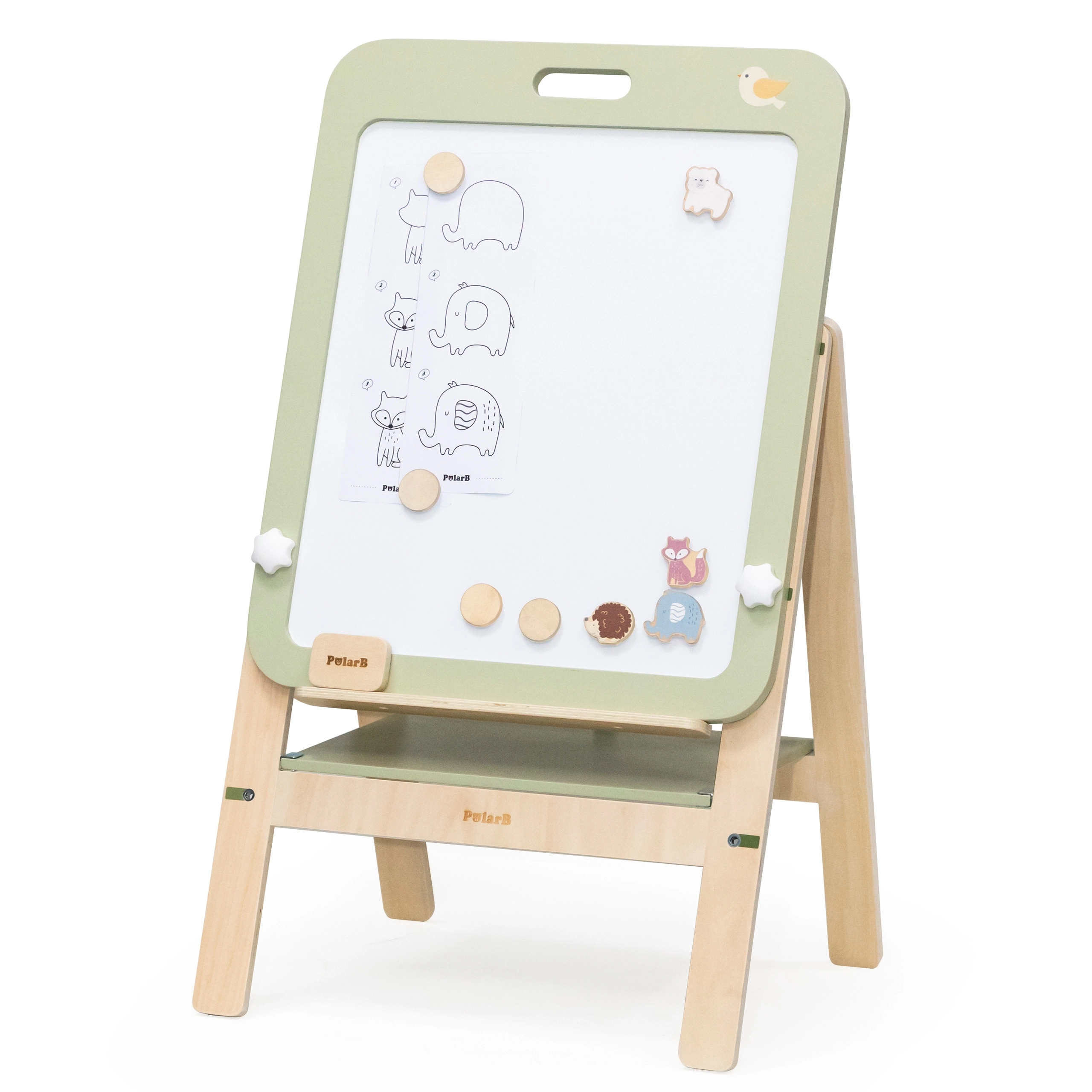 - Iekļauti dzīvnieku magnēti, koka magnēti papīra piestiprināšanai, dzēšgumija un pamācības PolarB dzīvnieku zīmēšanai