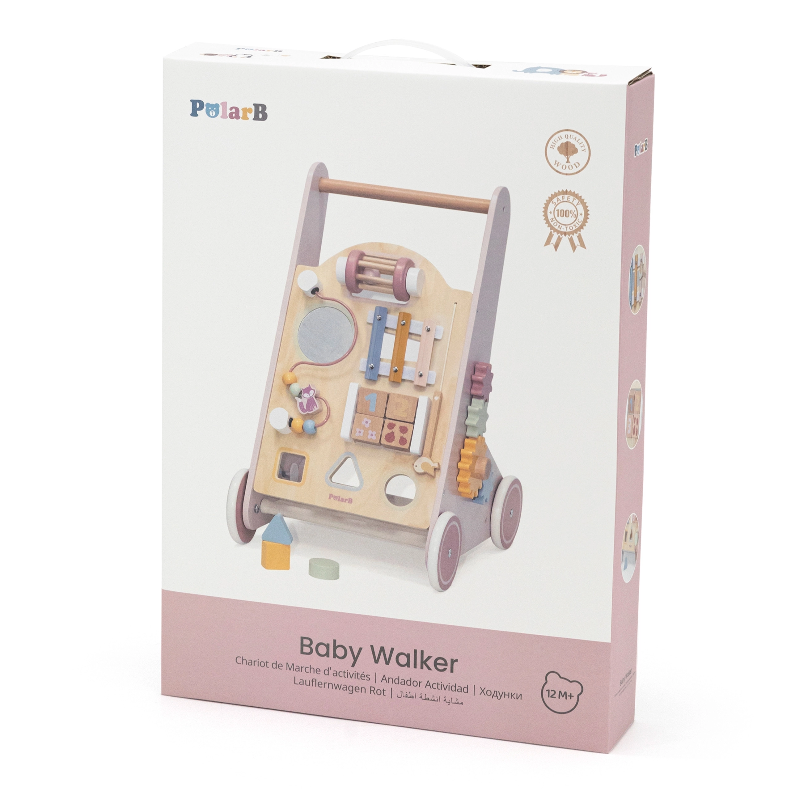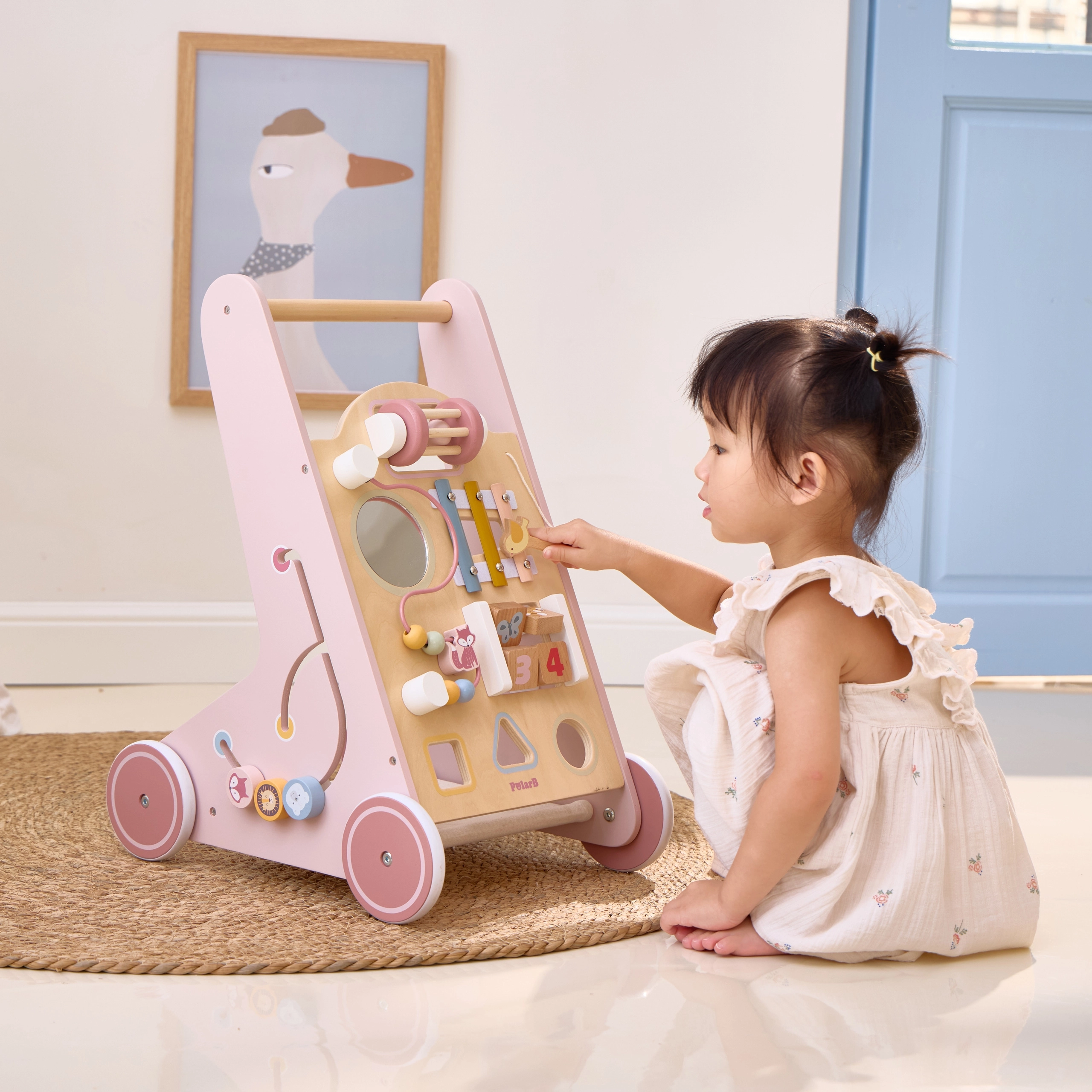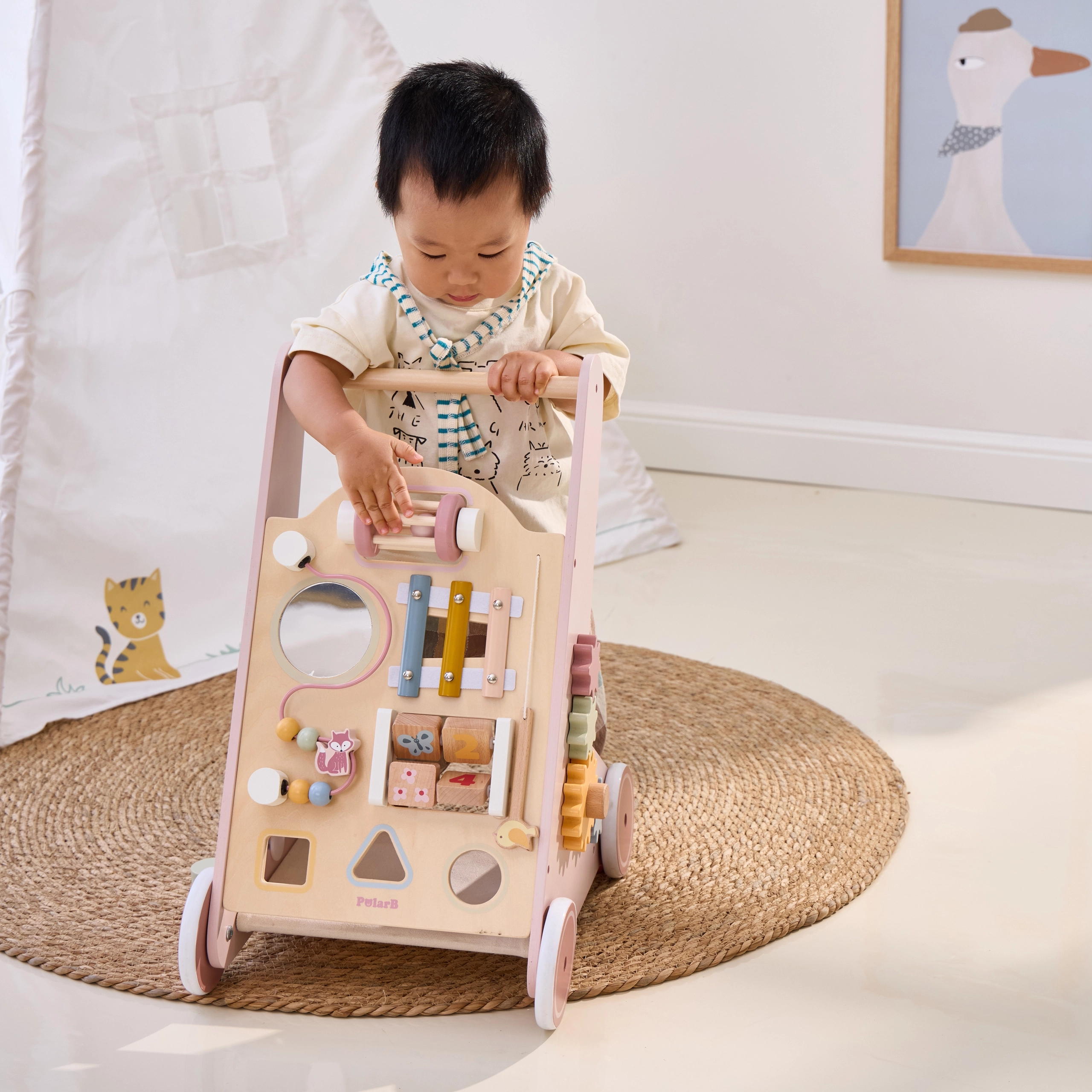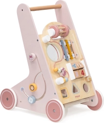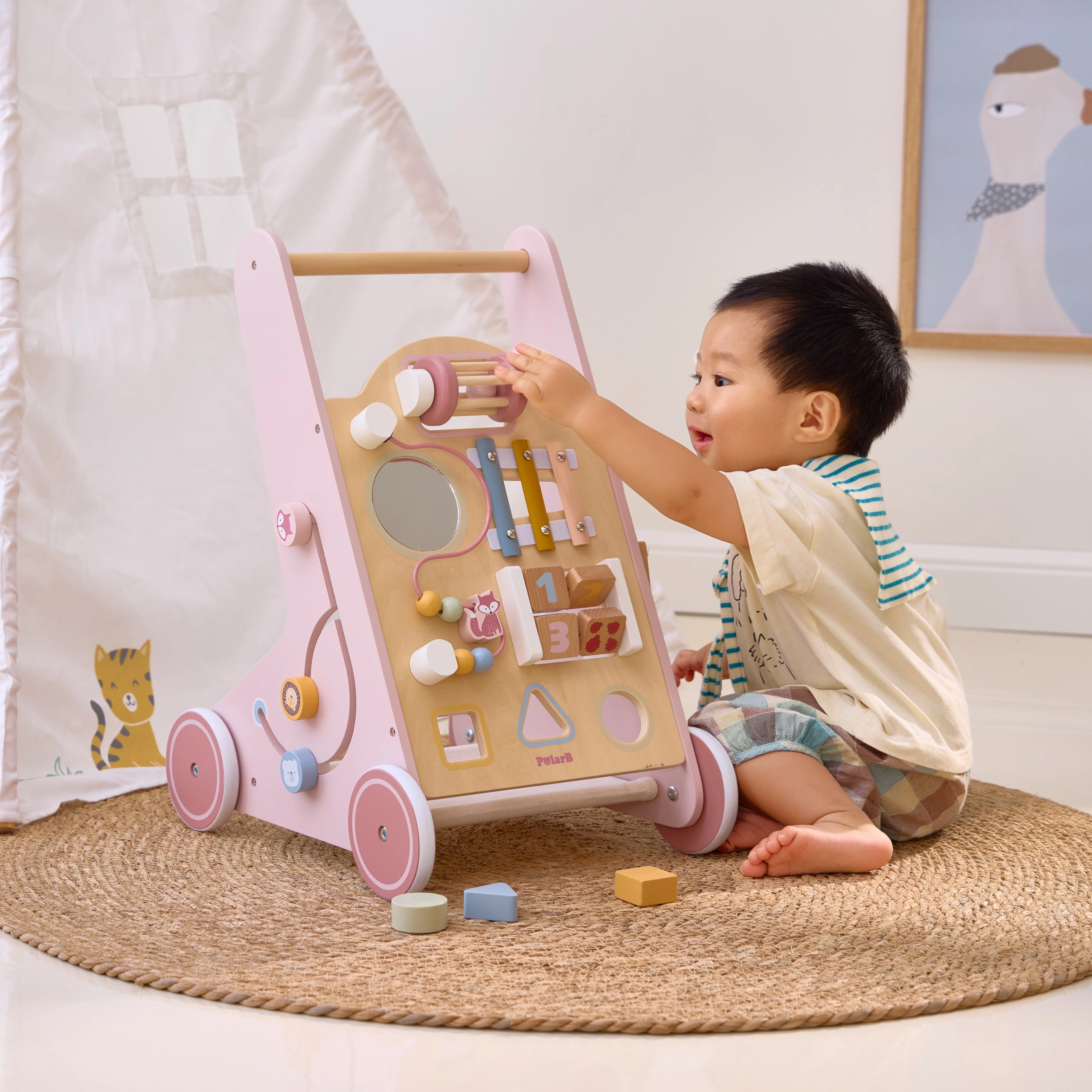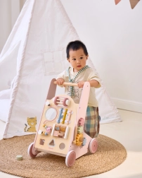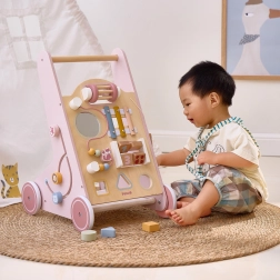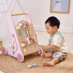 Iepazīstinām ar koka staiguļiem mazuļiem PolarB rozā krāsā, kas paredzēti bērniem no 18 mēnešu vecuma. Tie apvieno izklaidējošas aktivitātes, piemēram, skatīšanos spogulī, griežamus klucīšus, mirdzošas pērlītes, formu šķirošanu un spēlēšanu uz ksilofona. Ar šiem staiguļiem jūsu bērni droši izzinās apkārtējo pasauli.