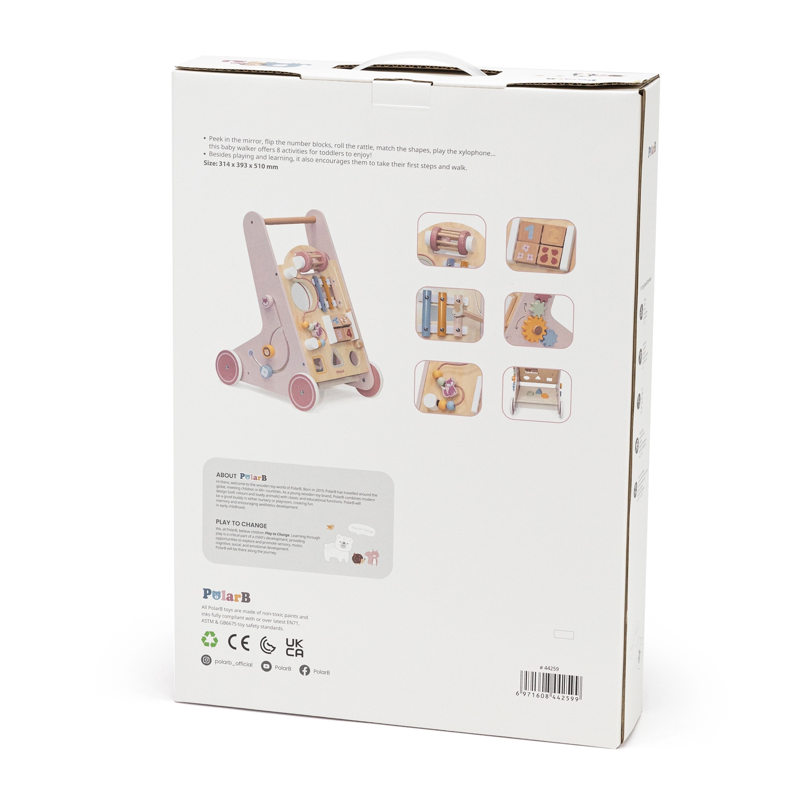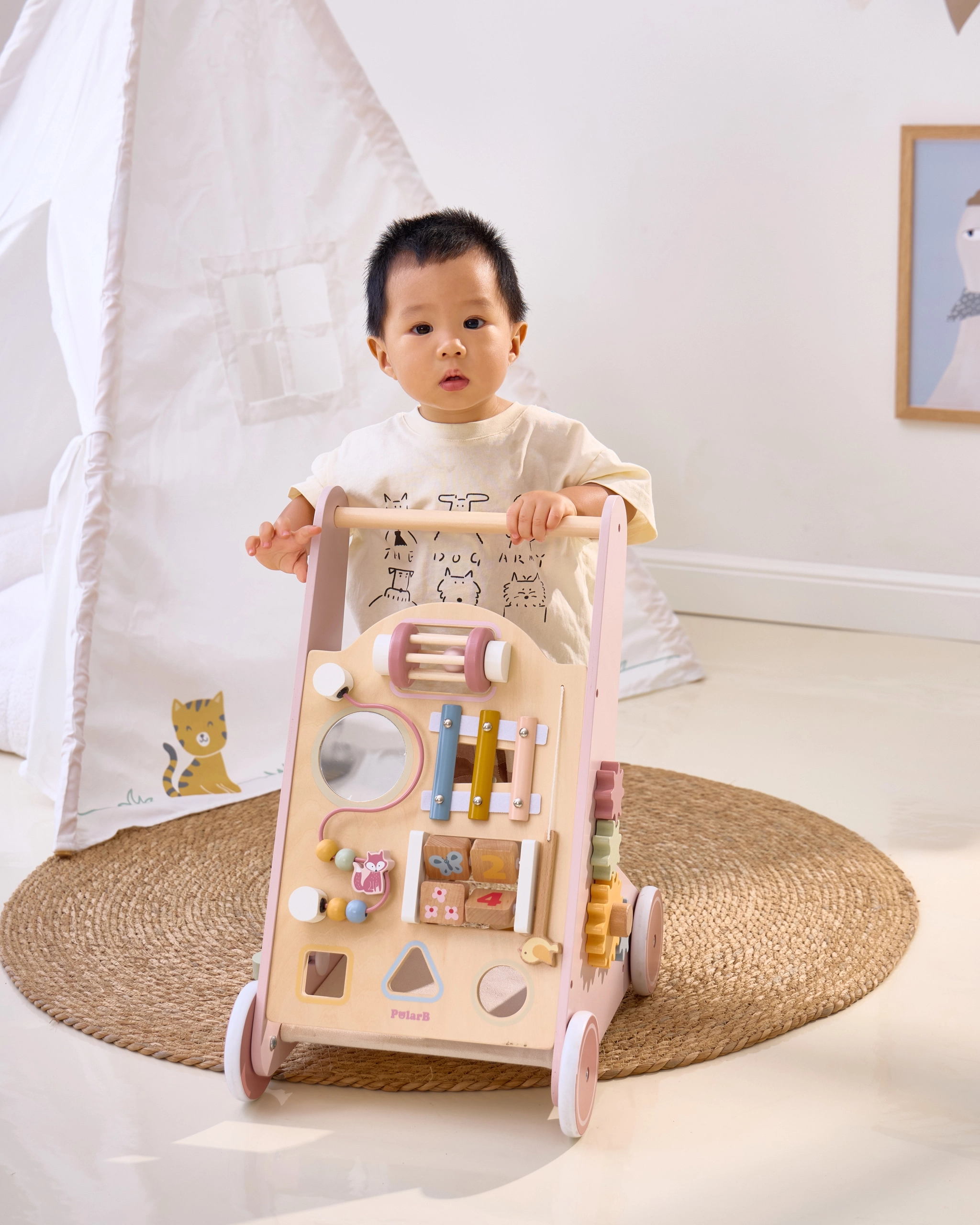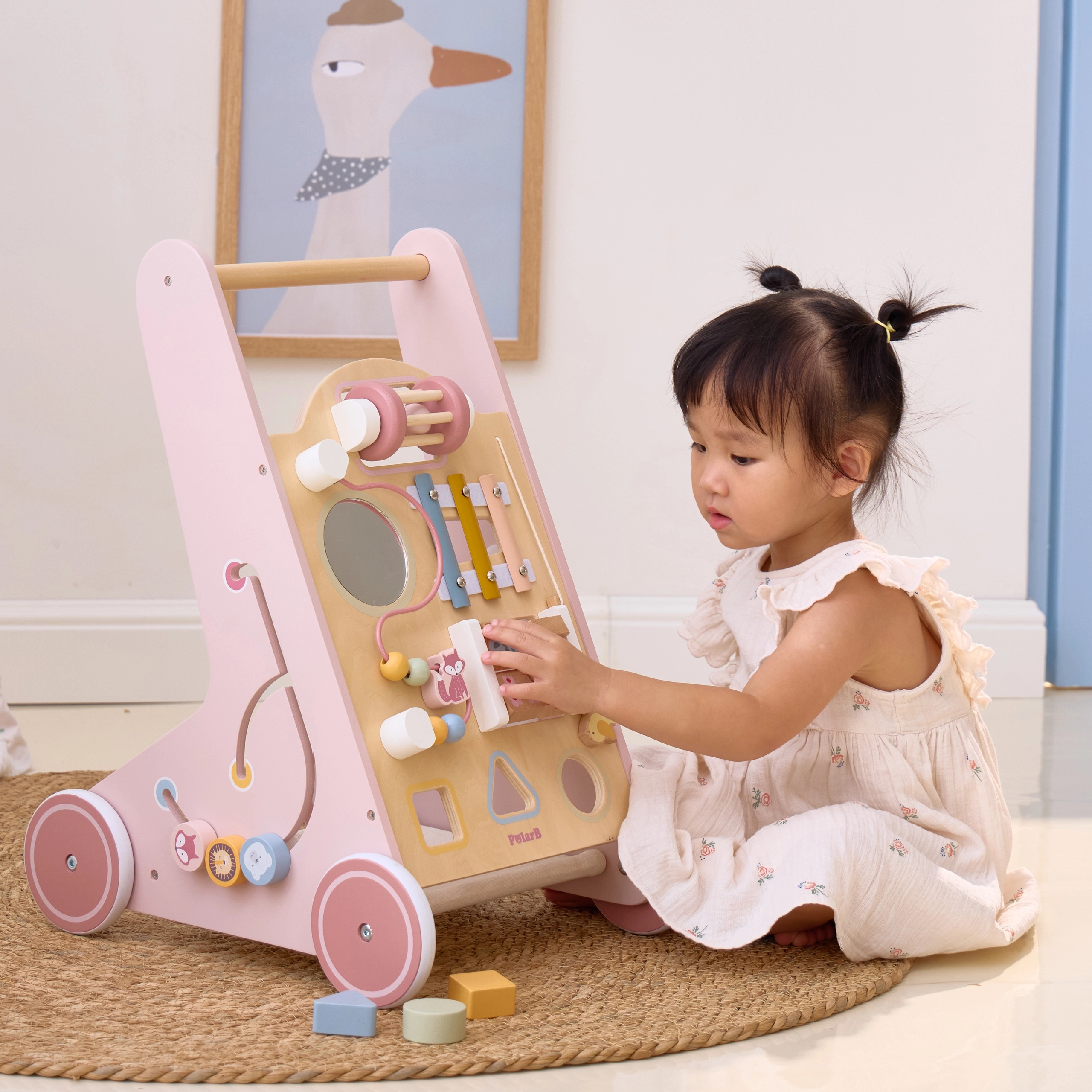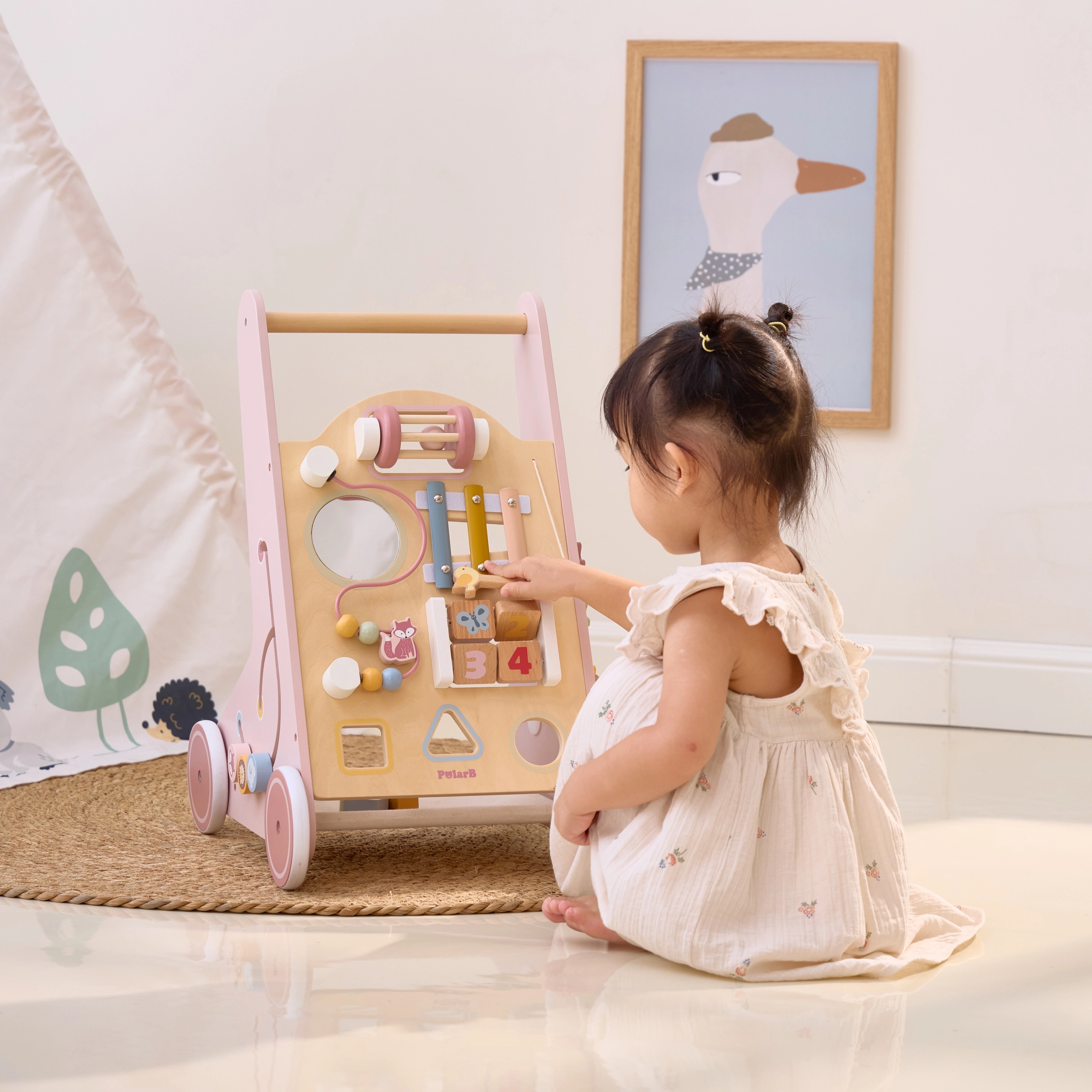 Iepazīstinām ar koka staiguļiem mazuļiem PolarB rozā krāsā, kas paredzēti bērniem no 18 mēnešu vecuma. Tie apvieno izklaidējošas aktivitātes, piemēram, skatīšanos spogulī, griežamus klucīšus, mirdzošas pērlītes, formu šķirošanu un spēlēšanu uz ksilofona. Ar šiem staiguļiem jūsu bērni droši izzinās apkārtējo pasauli.