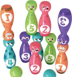 Komplektā ir 10 kegļi, katram ir atšķirīga seja un tas ir dažādās krāsās, kas piesaista bērnu uzmanību un rosina spēlēties. Turklāt kegļiem ir plakanotas virsotnes, kas ļauj tos likt citu uz cita un veidot krāsainus torņus. Tādējādi bērns var priecāties ne tikai par tradicionālo boulinga spēli, bet arī par radošu kegļu kārtošanu.
