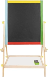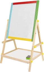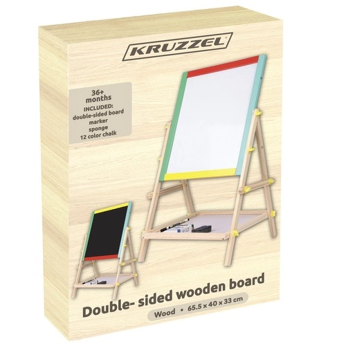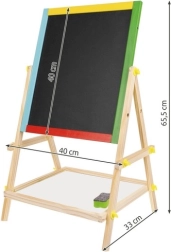 Stabila koka konstrukcija ar krāsainiem elementiem ir izturīga un droša bērniem. Praktiskais plauktiņš piederumiem nodrošina, ka krītiņi, marķieris un sūklis vienmēr ir pa rokai. Vienkārša montāža bez speciāliem instrumentiem iepriecinās ikvienu vecāku, un kompaktie izmēri der bērnistabai vai rotaļu telpai.