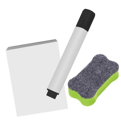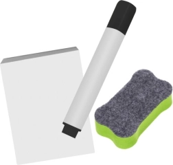Komplektācijā ietilpst plauktiņš piederumu uzglabāšanai un sākuma komplekts: krāsaini krītiņi, marķieris un sūklis tūlītējai lietošanai.