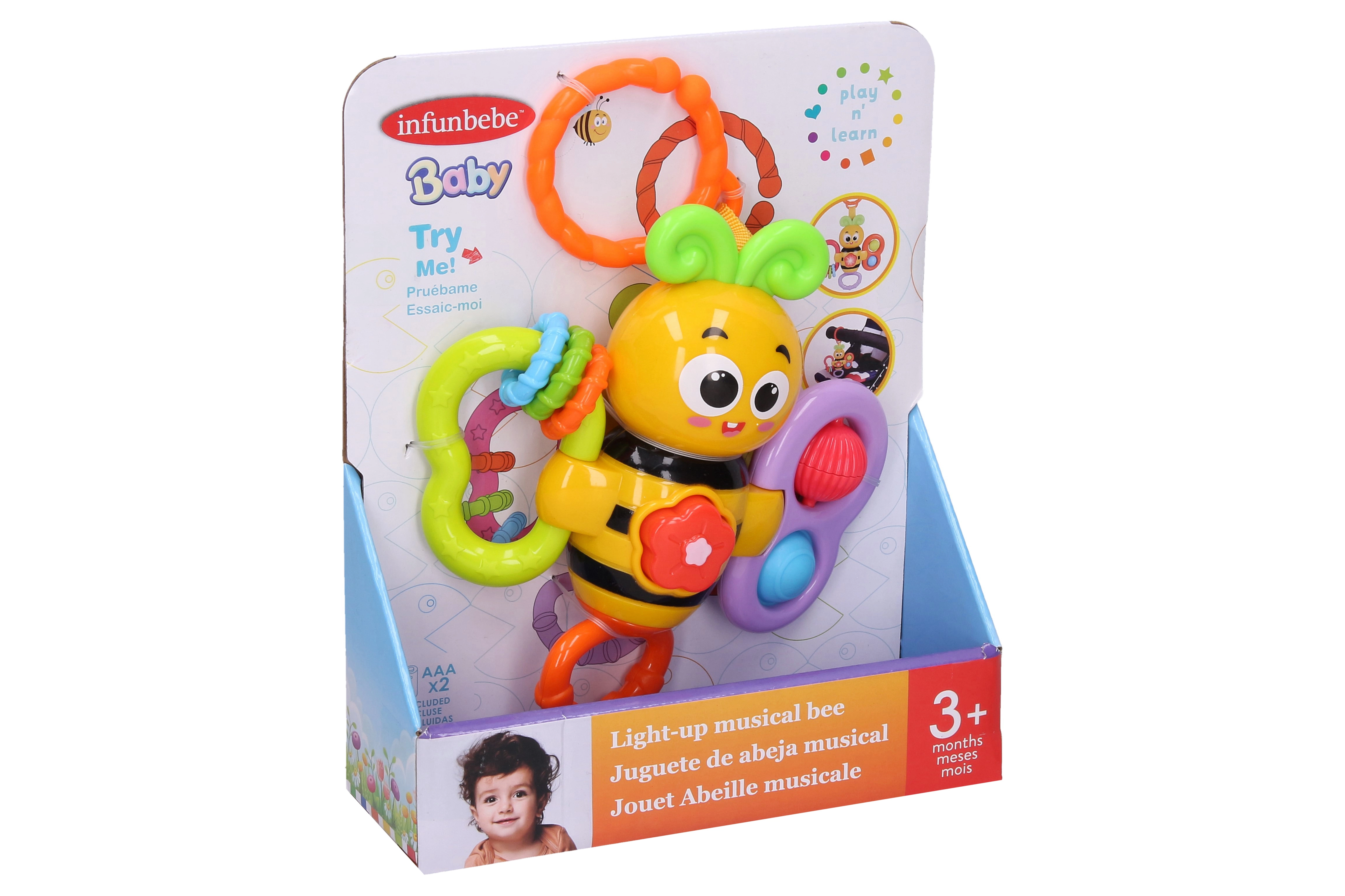 Mīlīga spēlējoša bitīte ar praktisku klipsi iepriecinās bērnus ar melodiskiem skaņām un jautru grabināšanu. Pateicoties kompaktajam 14 cm izmēram, to viegli piestiprināt pie ratiņiem, gultiņas vai autosēdeklīša. Poga melodiju ieslēgšanai un pārslēgšanai, grabināšanas elementi un 2× AAA baterijas komplektā padara to par lielisku ceļabiedru gan mājās, gan ārpus tās.