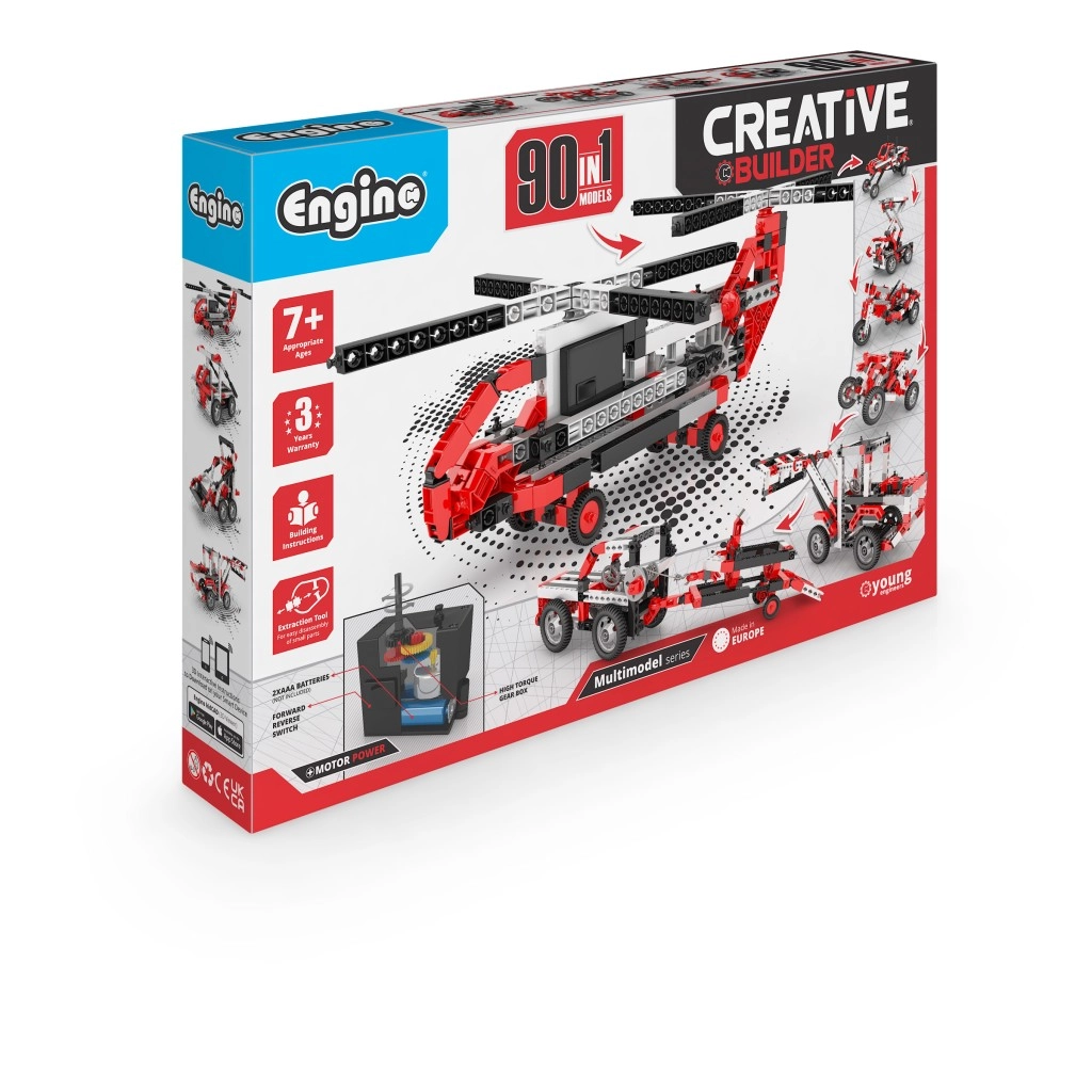 Atklājiet bezgalīgas būvēšanas iespējas ar ENGINO Creative Builder 90 vienā un motoru modeļu piedziņai. No viena komplekta varat salikt līdz pat 90 dažādiem modeļiem – no automašīnām un motocikliem līdz lidmašīnām un helikopteriem. Ar interaktīvo lietotni kidCAD 3D varat modeļus griezt, pietuvināt un mācīties soli pa solim. Piemērots no 7 gadu vecuma, savietojams ar citiem ENGINO konstruktoriem.