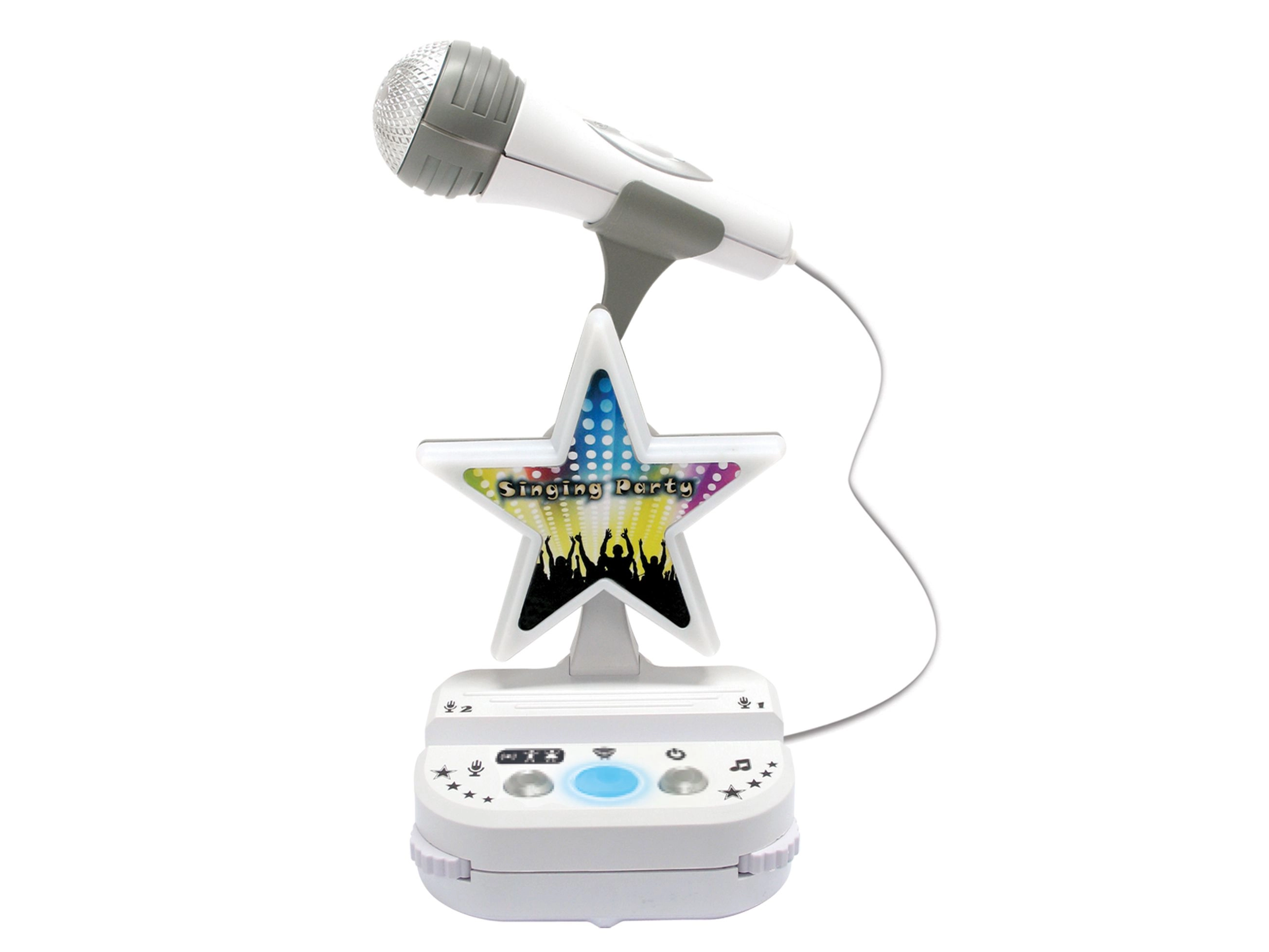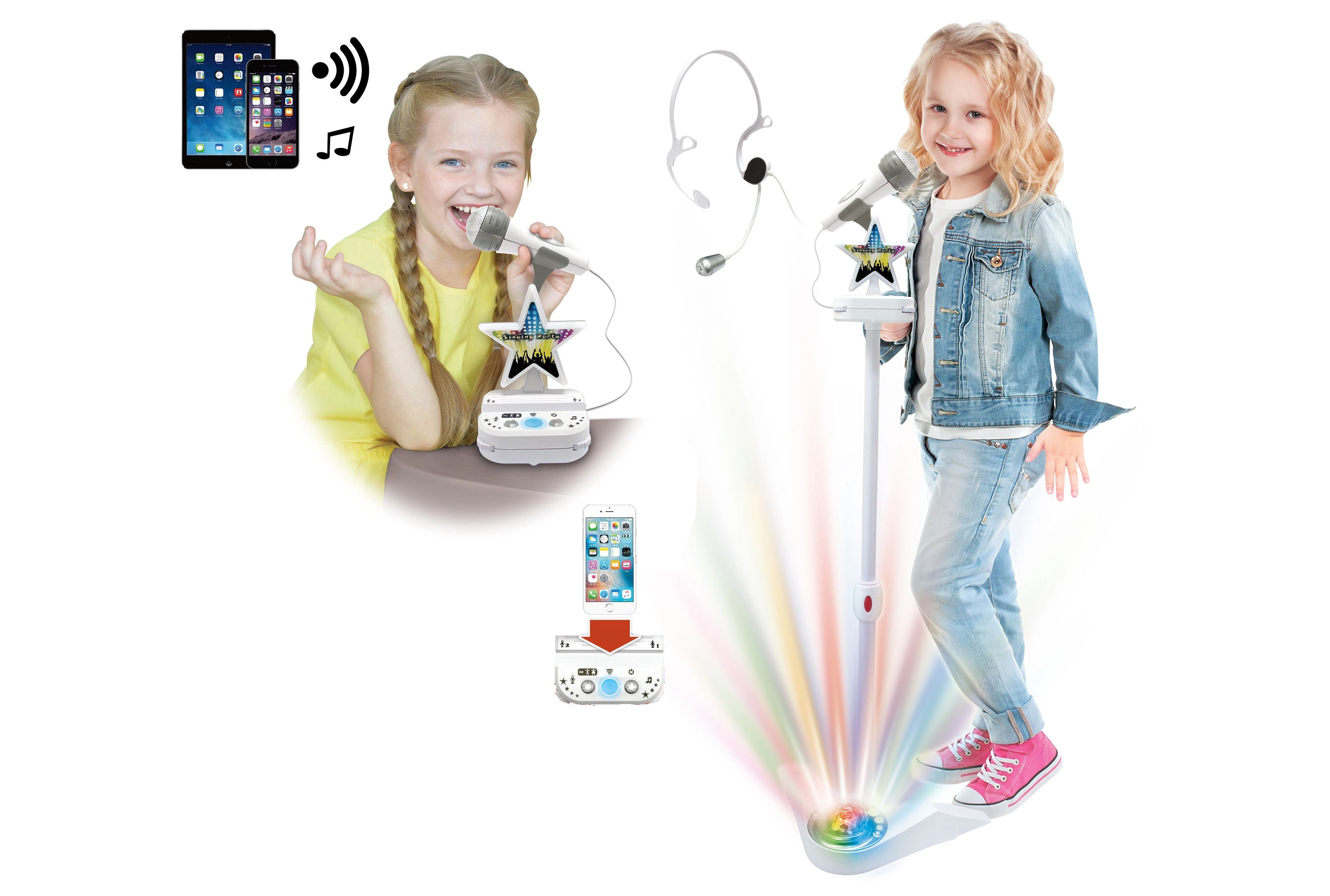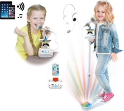 Ar šo Bluetooth karaoke komplektu jūs izbaudīsiet daudz jautrības. Komplektā ir karaoke modulis, statīvs ar mikrofonu un galvas mikrofons, kas nodrošina stabilu un ērtu dziedāšanu arī kustoties. Vadības panelis ir aprīkots ar turētāju mobilajam tālrunim vai MP3 atskaņotājam, lai jūs varētu ērti sekot līdzi tekstiem vai video.