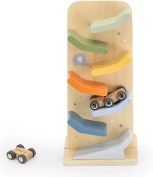 Krāsaina rampu trase ar mašīnīti mudina uz atkārtotu spēli, stiprina novērošanu, koordināciju un izpratni par cēloņsakarībām.