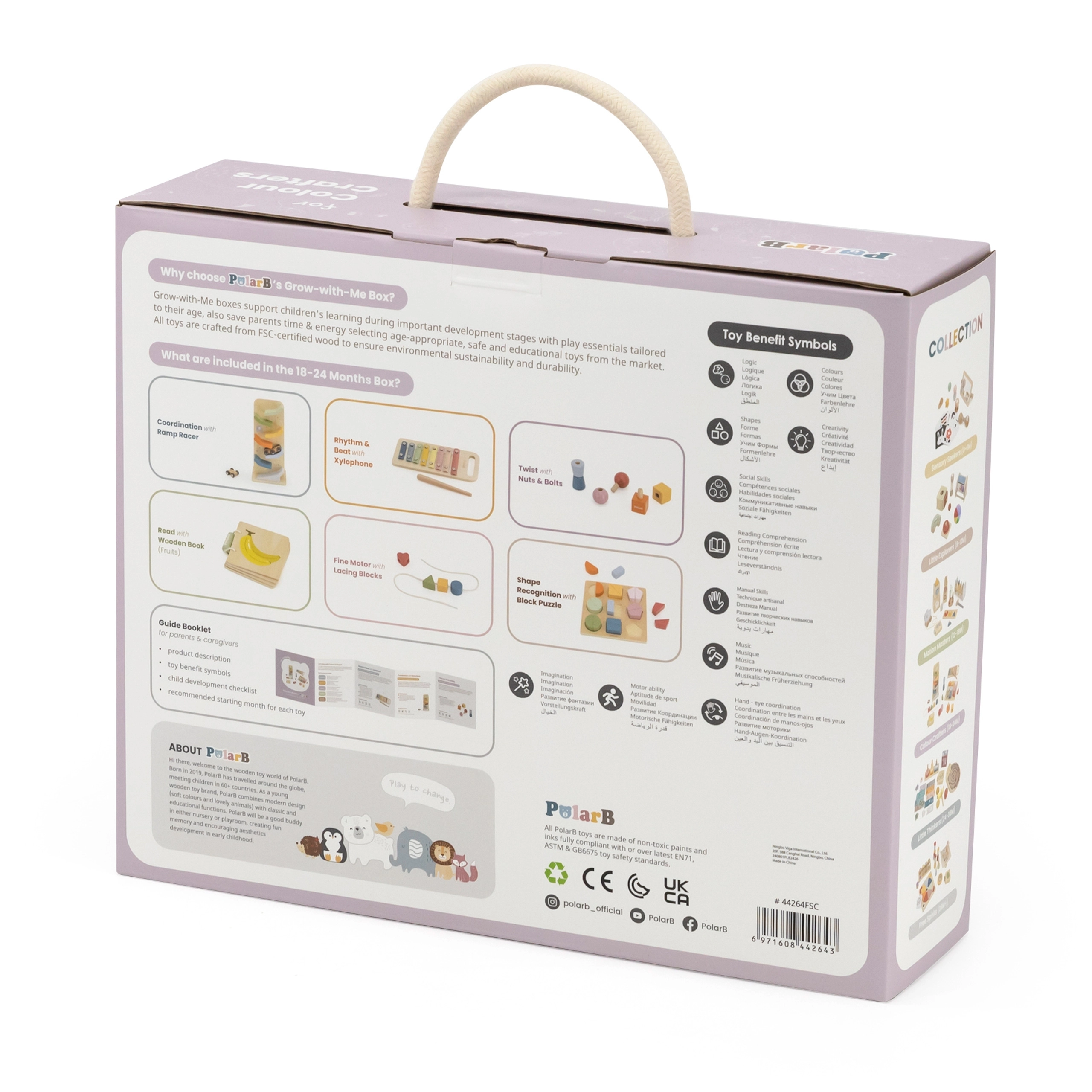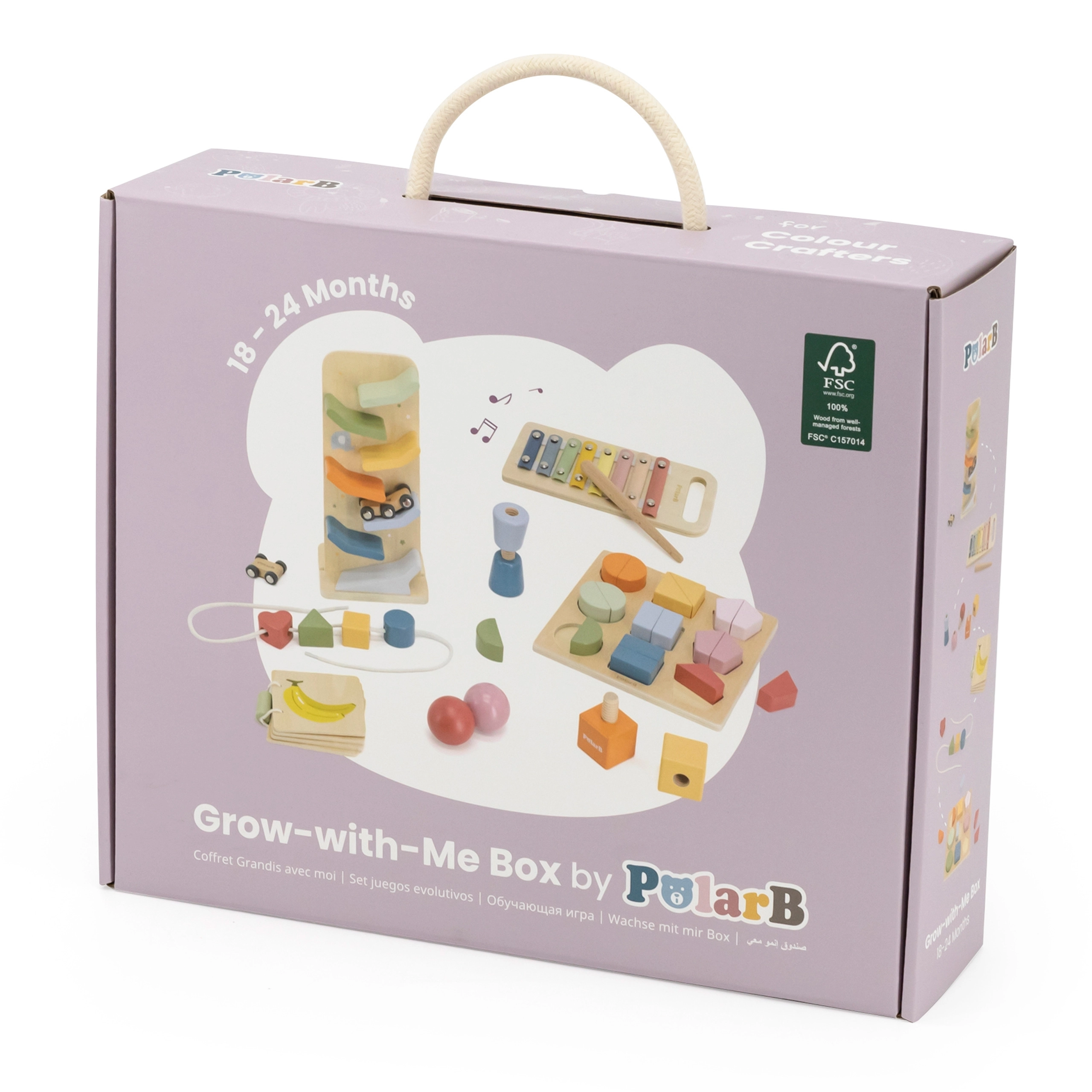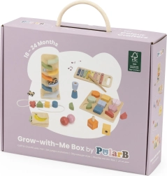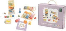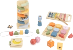 Atklājiet visaptverošu koka rotaļlietu komplektu pašiem mazākajiem, kas attīsta smalko motoriku, acu–roku koordināciju, krāsu un formu atpazīšanu, kā arī pirmo muzikālo uztveri. Praktiskā pārvadāšanas kaste ar rokturi notur visu vienuviet un ir ideāli piemērota gan mājās, gan ceļā.
