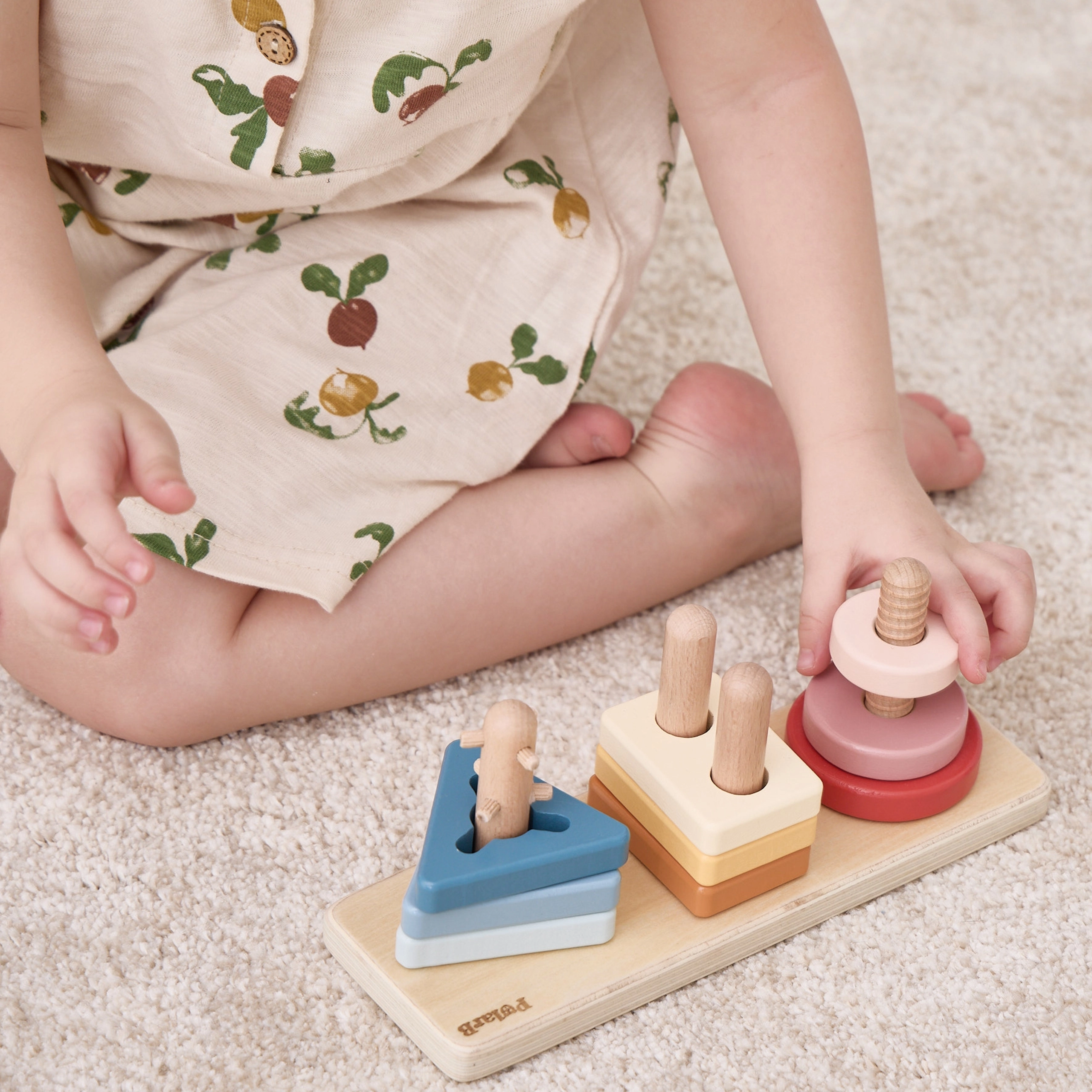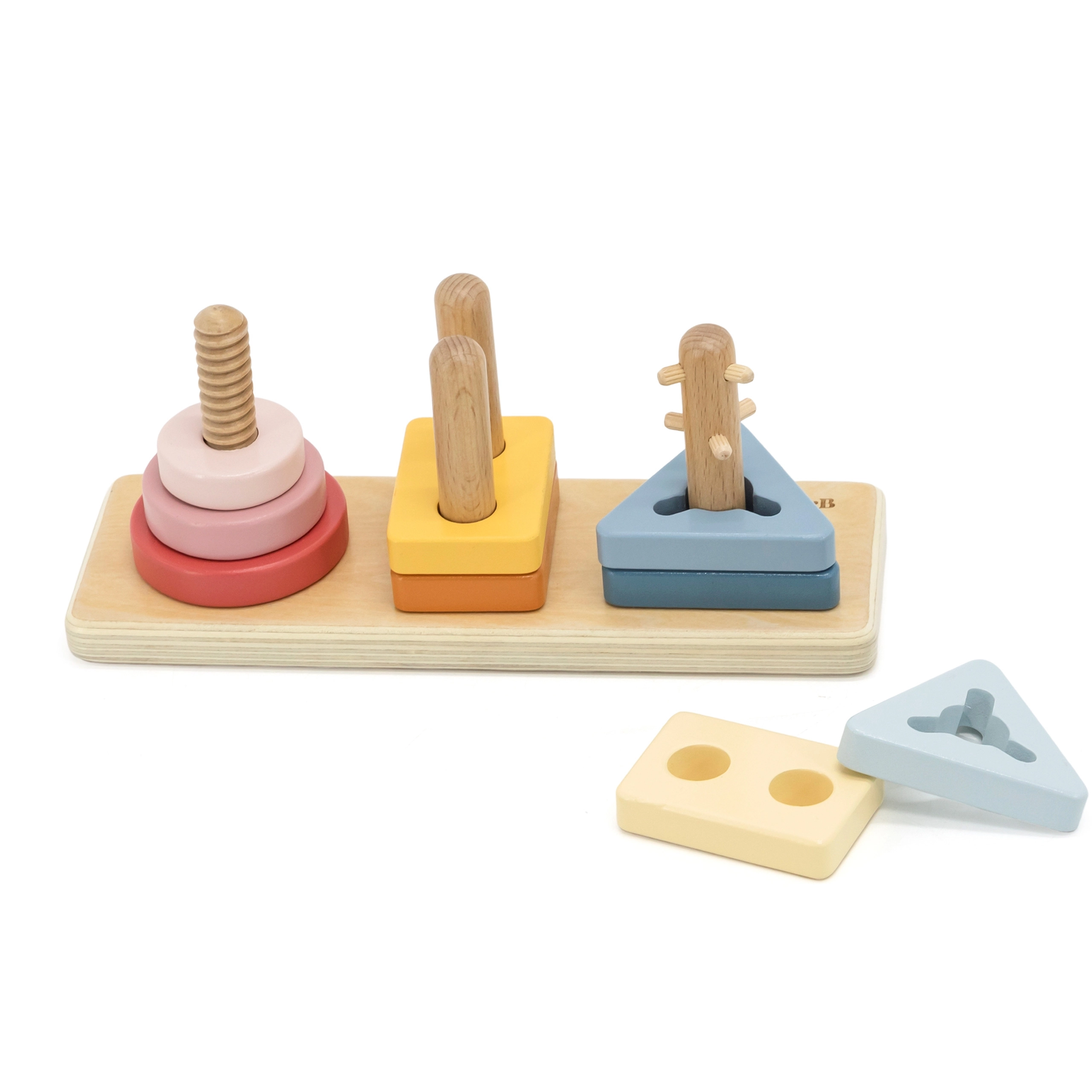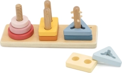 Koka detaļas un tapinas māca atpazīt formas un krāsas, veicina telpisko domāšanu un loģisku šķirošanu. Lieliski piemērots pirmajiem soļiem ģeometrijā.