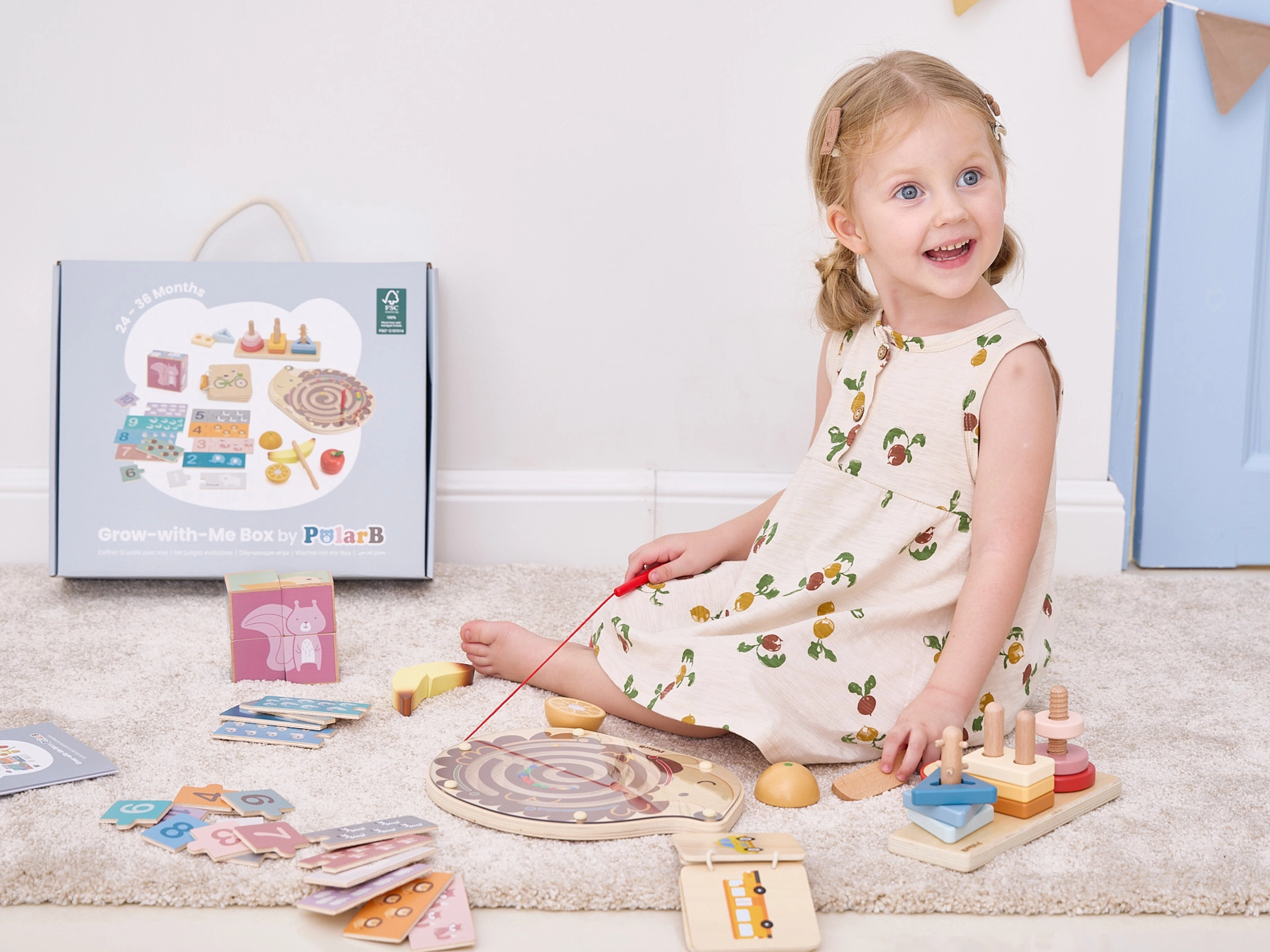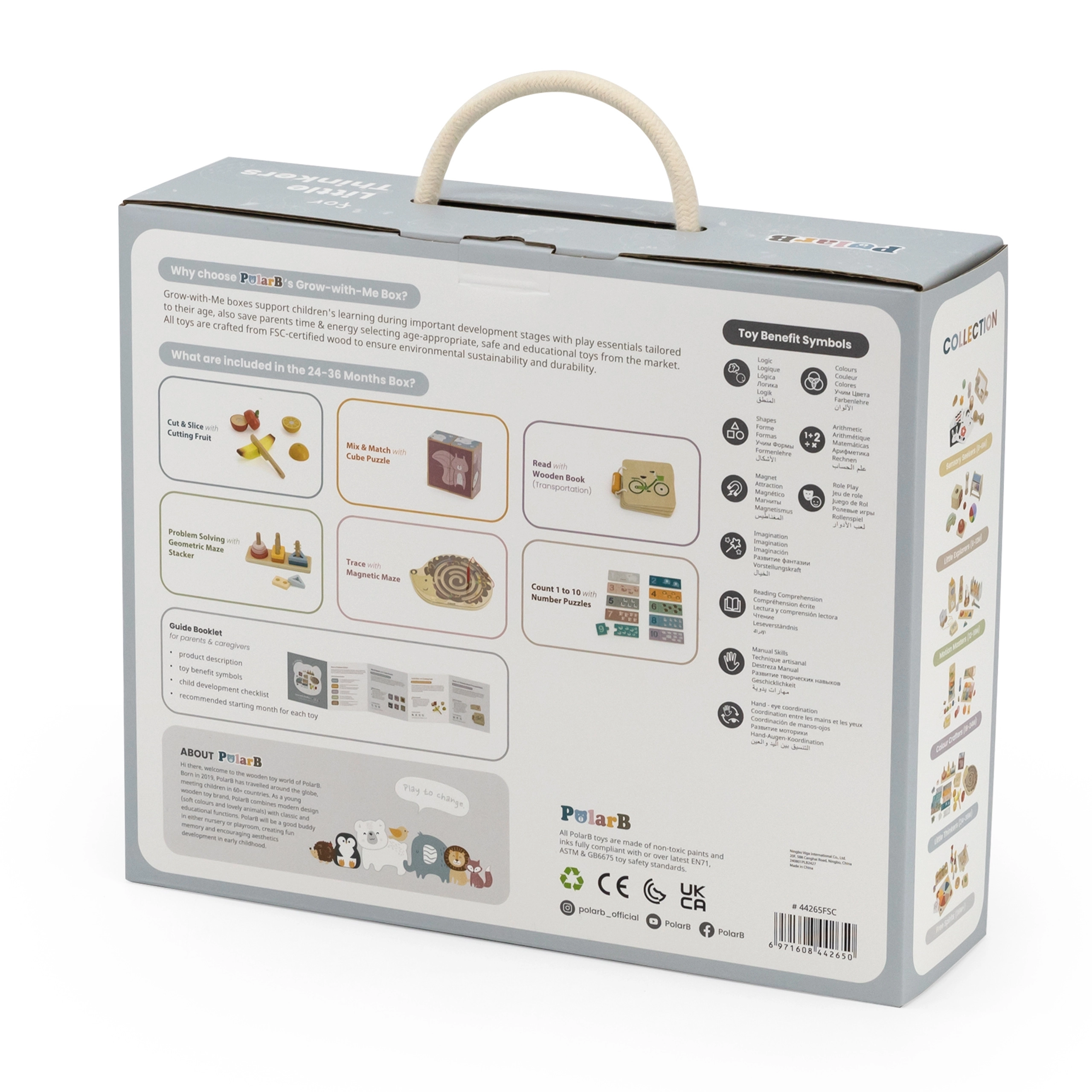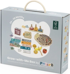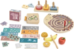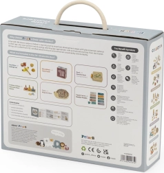 Komplektā ietilpst magnētiskais ezīša labirints, salikšanas spēles un puzles, augļu griešanas komplekts un koka grāmatiņa ar transportlīdzekļiem. Viss ievietots praktiskā kastē ar rokturi ērtai pārnēsāšanai. Ideāla izvēle mazajiem pētniekiem, kas gatavi sarežģītākiem uzdevumiem.