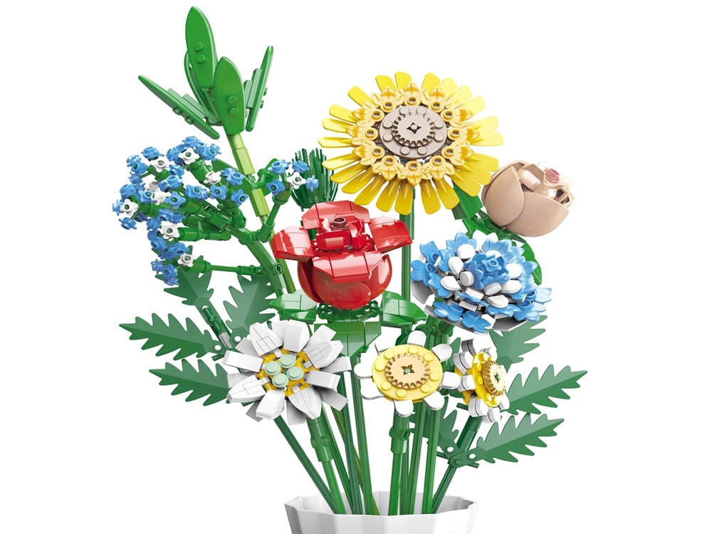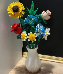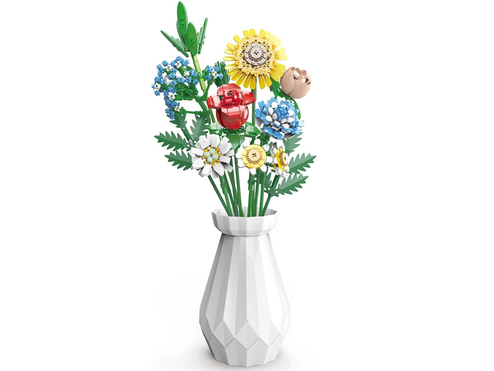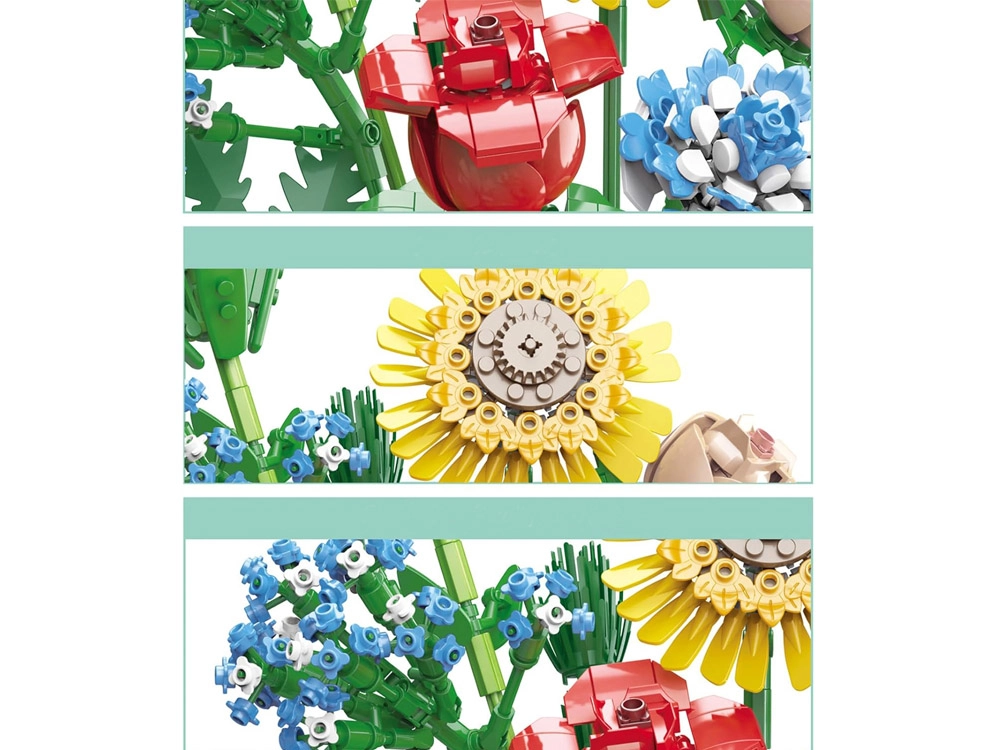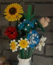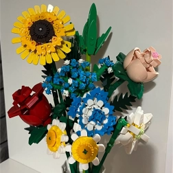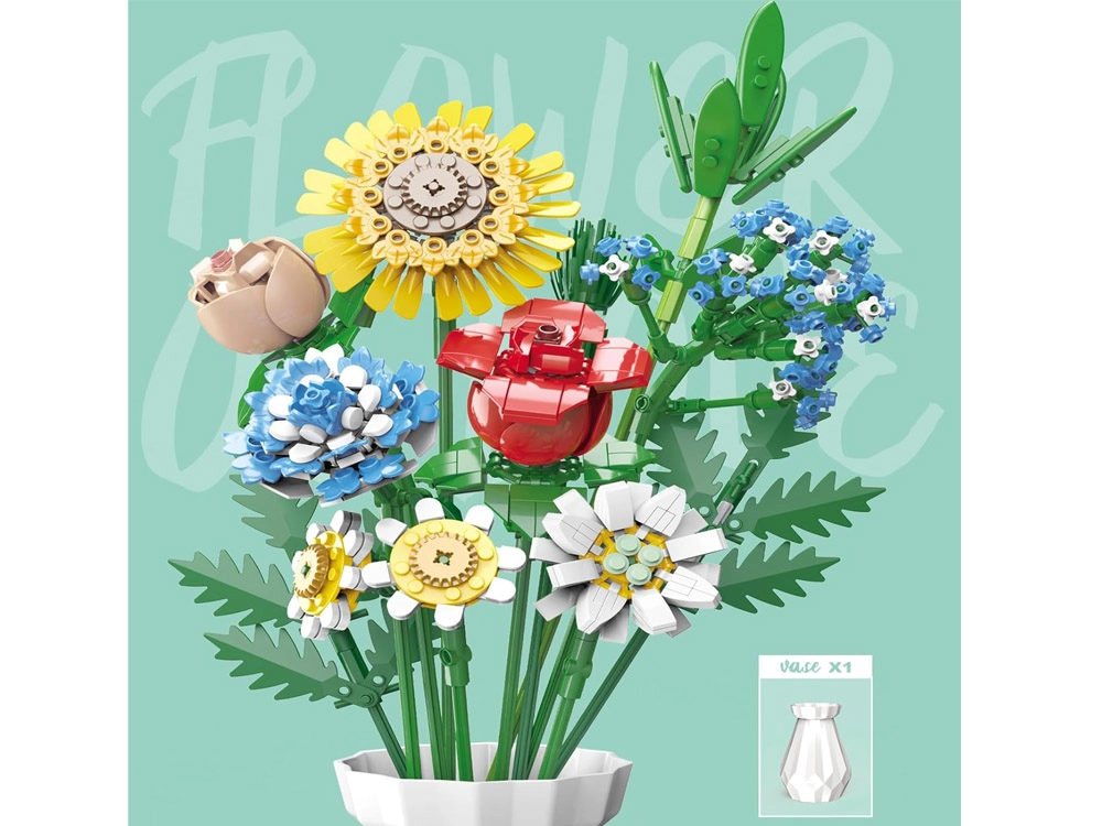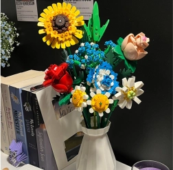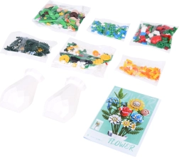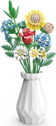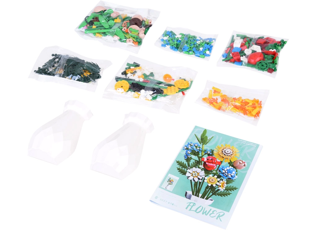 Pārtapini konstruktoru par dizaina dekoru. Krāsainais pušķis no celtniecības detaļām ietver saulespuķi, rozes, neļķi, margrietiņu, liliju, neaizmirstulīti un zaļos akcentus (haitong lapas, ciedrs, zāle). Komplektā ir arī elegants krēmkrāsas flakons, tāpēc gatavo pušķi varat uzreiz izlikt uz plaukta vai galda.