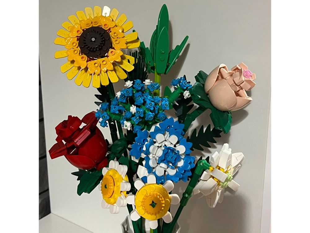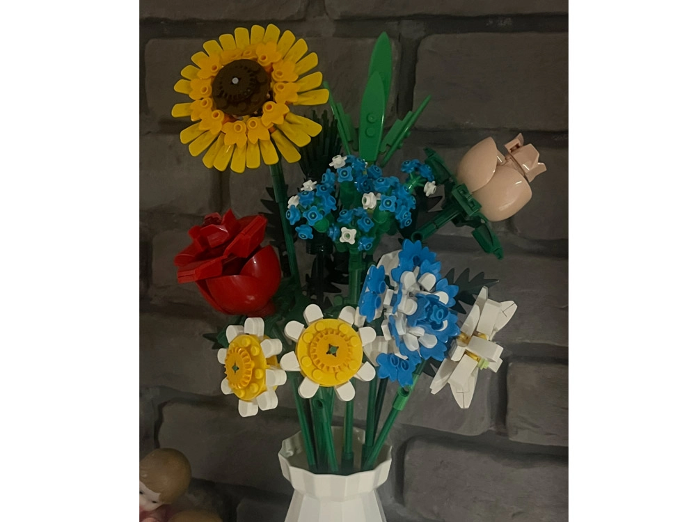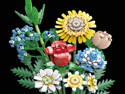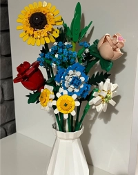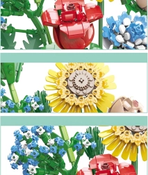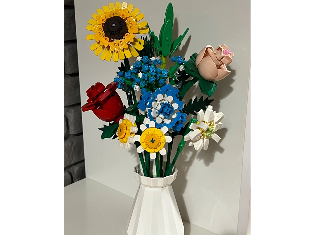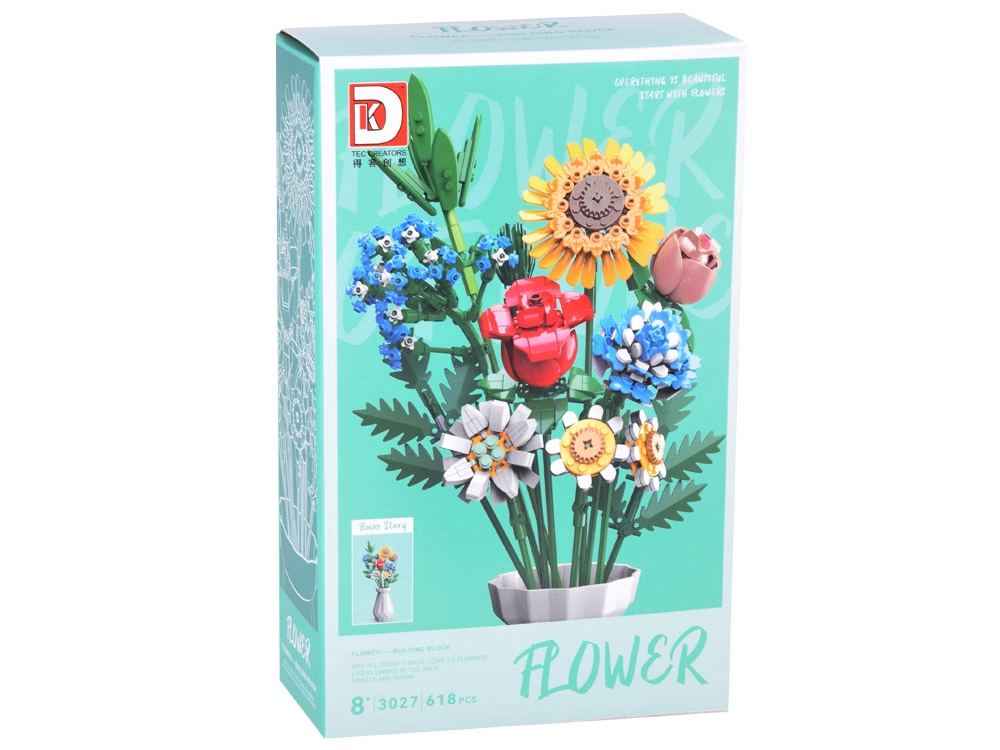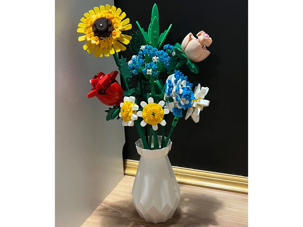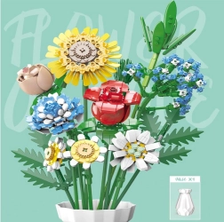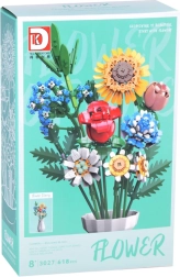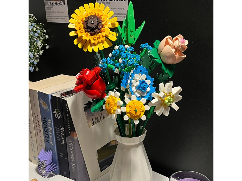 Pārtapini konstruktoru par dizaina dekoru. Krāsainais pušķis no celtniecības detaļām ietver saulespuķi, rozes, neļķi, margrietiņu, liliju, neaizmirstulīti un zaļos akcentus (haitong lapas, ciedrs, zāle). Komplektā ir arī elegants krēmkrāsas flakons, tāpēc gatavo pušķi varat uzreiz izlikt uz plaukta vai galda.