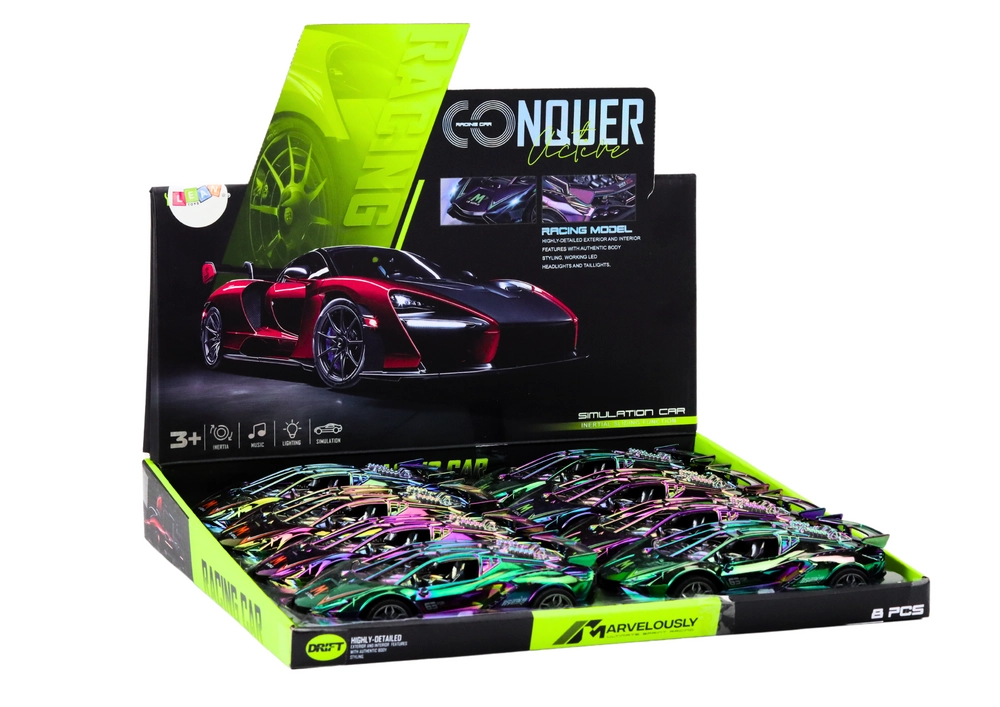 Sporta rotaļu auto ar unikālu kameļeona virsbūvi apbur ar varavīksnes spīdumu un mainīgiem toņiem, kas piesaista uzmanību ikvienā kustībā. Iebūvētās gaismas un reālistiskas skaņas pastiprina spēles pieredzi un pārvērš jebkuru istabu sacīkšu trasē.