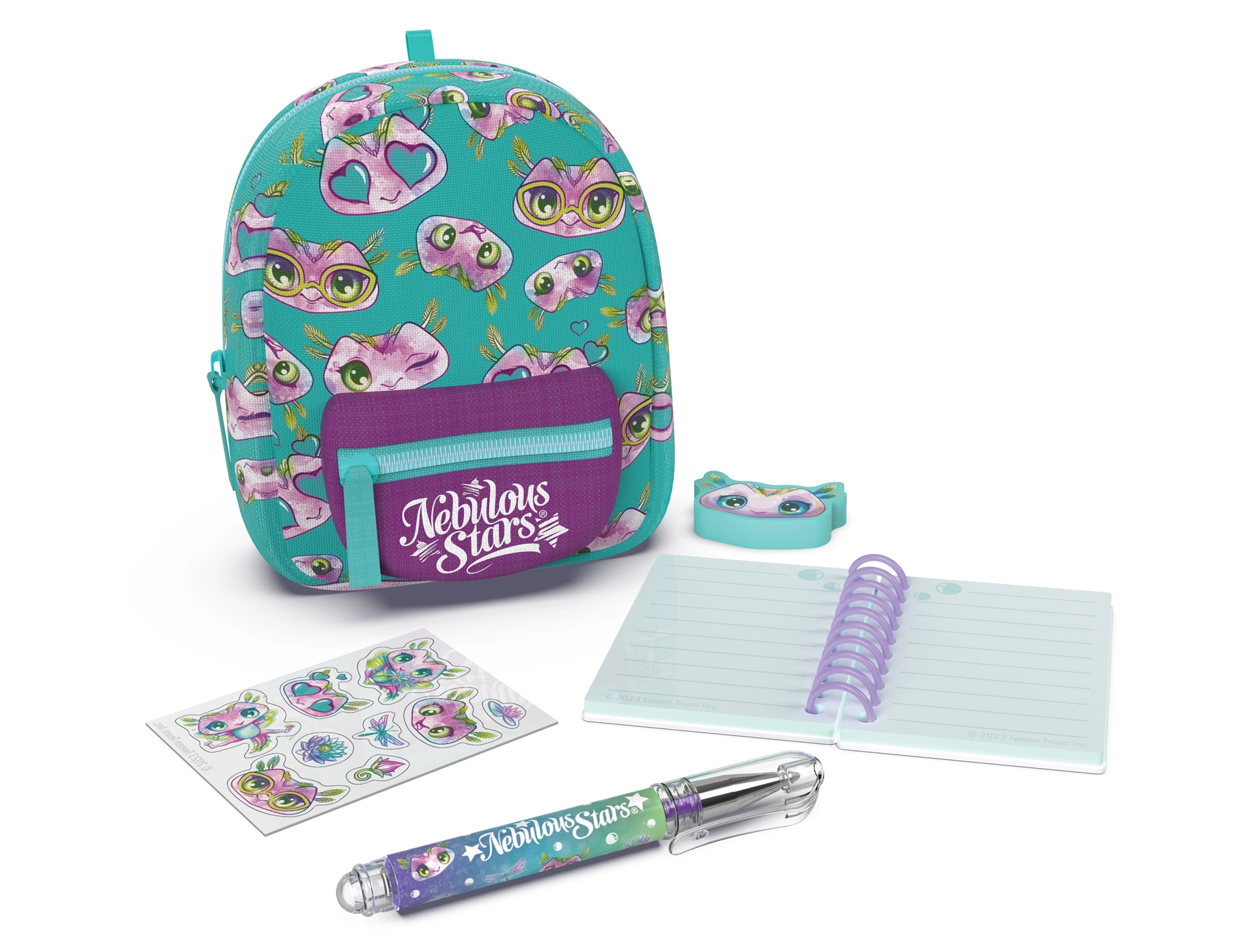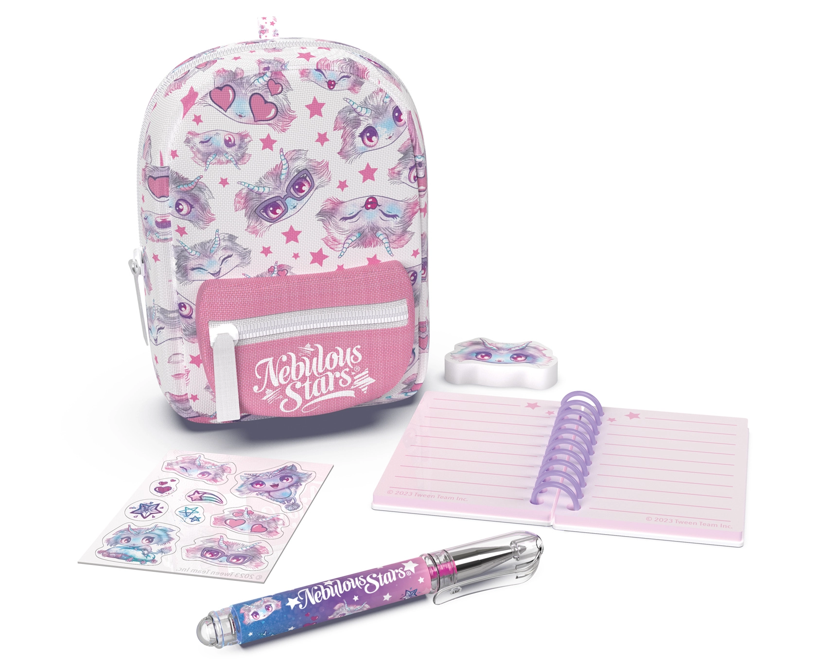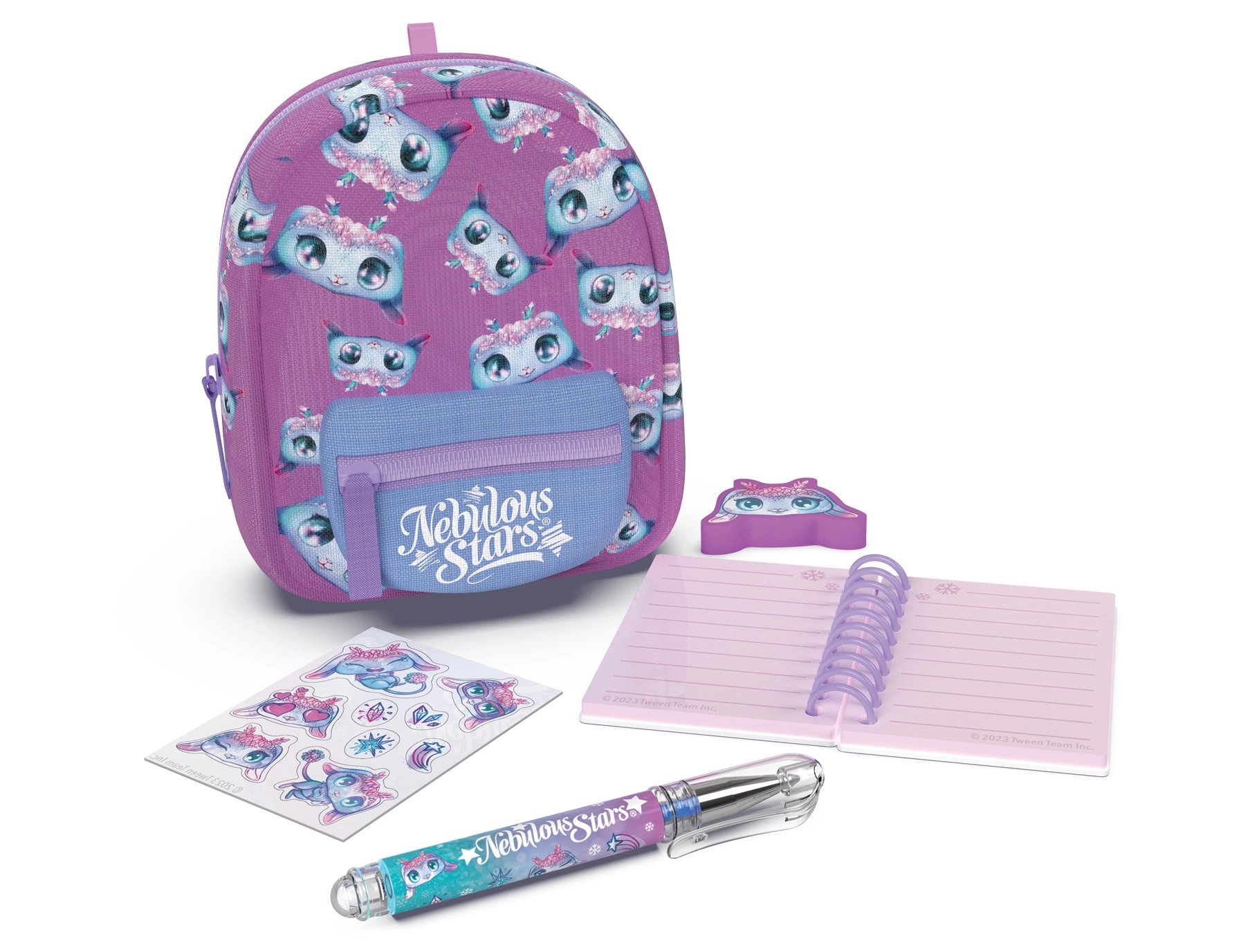 Stilīga mini mugursiņa NEBULOUS STARS ar kancelejas komplektu ir ideāli piemērota mazajiem radošuma mīļotājiem un ceļojumiem. Kompaktajos izmēros 9 × 6 × 11 cm tā slēpj visu nepieciešamo: rindotu piezīmju bloku, pildspalvu, dzēšgumiju, uzlīmes un mīlīgu piekariņu. Pieejamas 3 krāsu versijas – zila, balta un violeta.