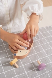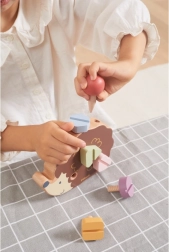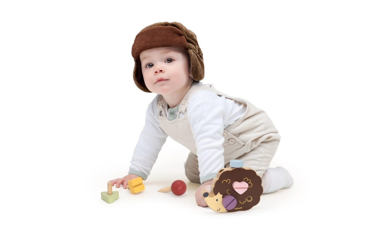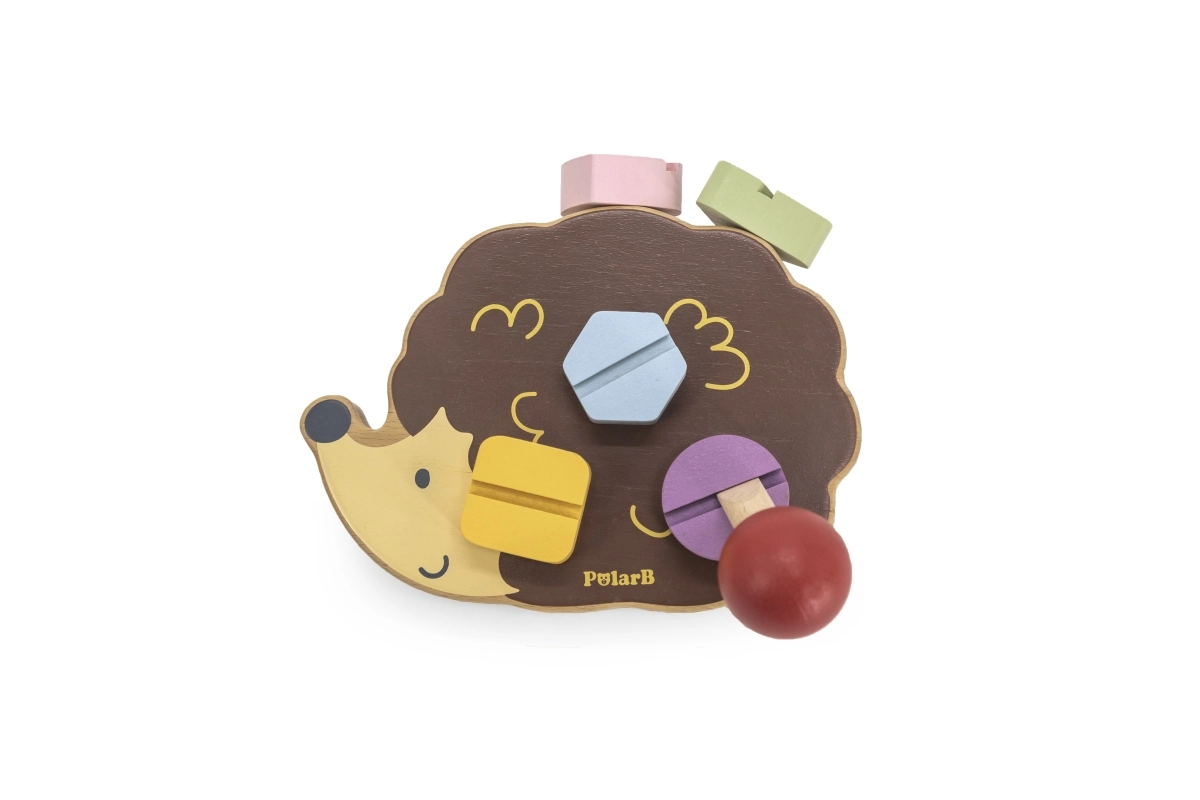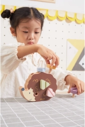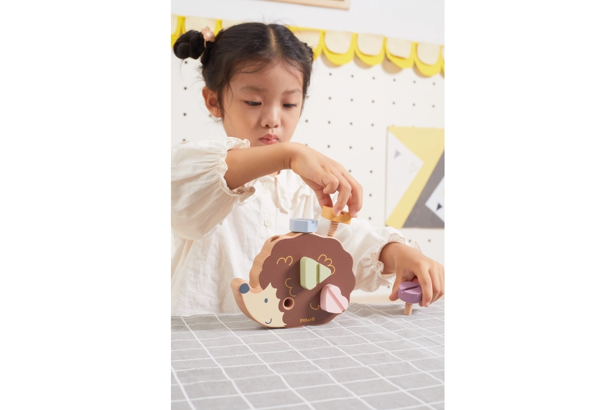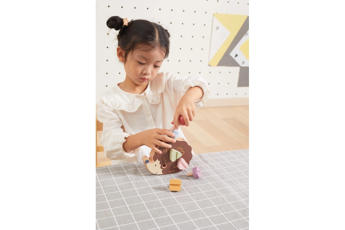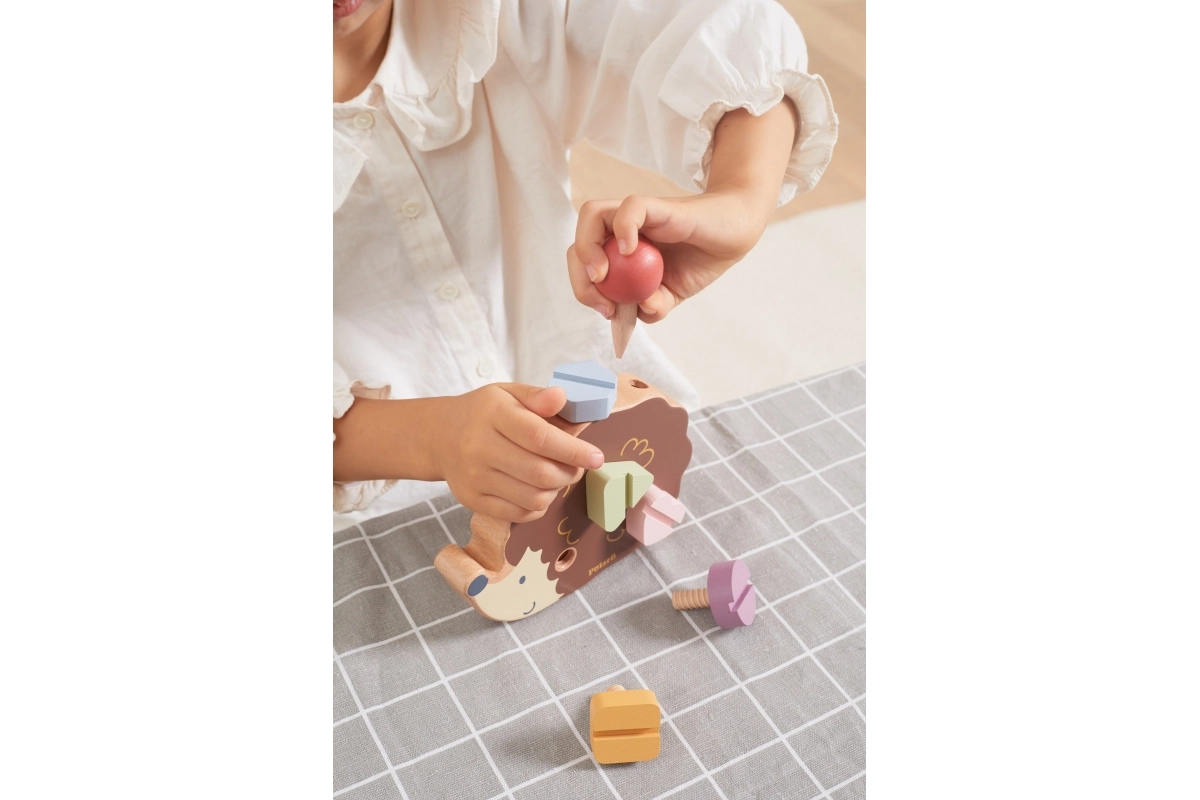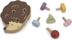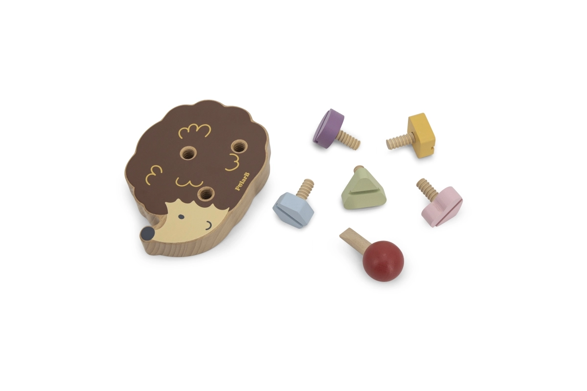 Koka ezītis ļauj bērniem trenēt sīko motoriku, izmantojot dažādu krāsu un formu skrūves.