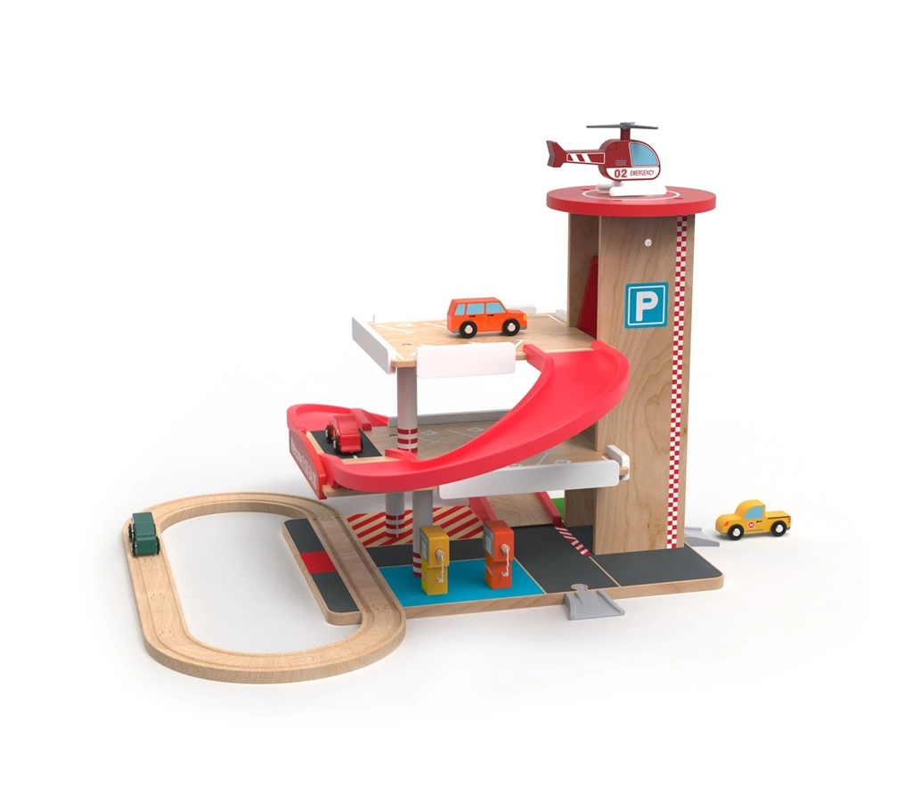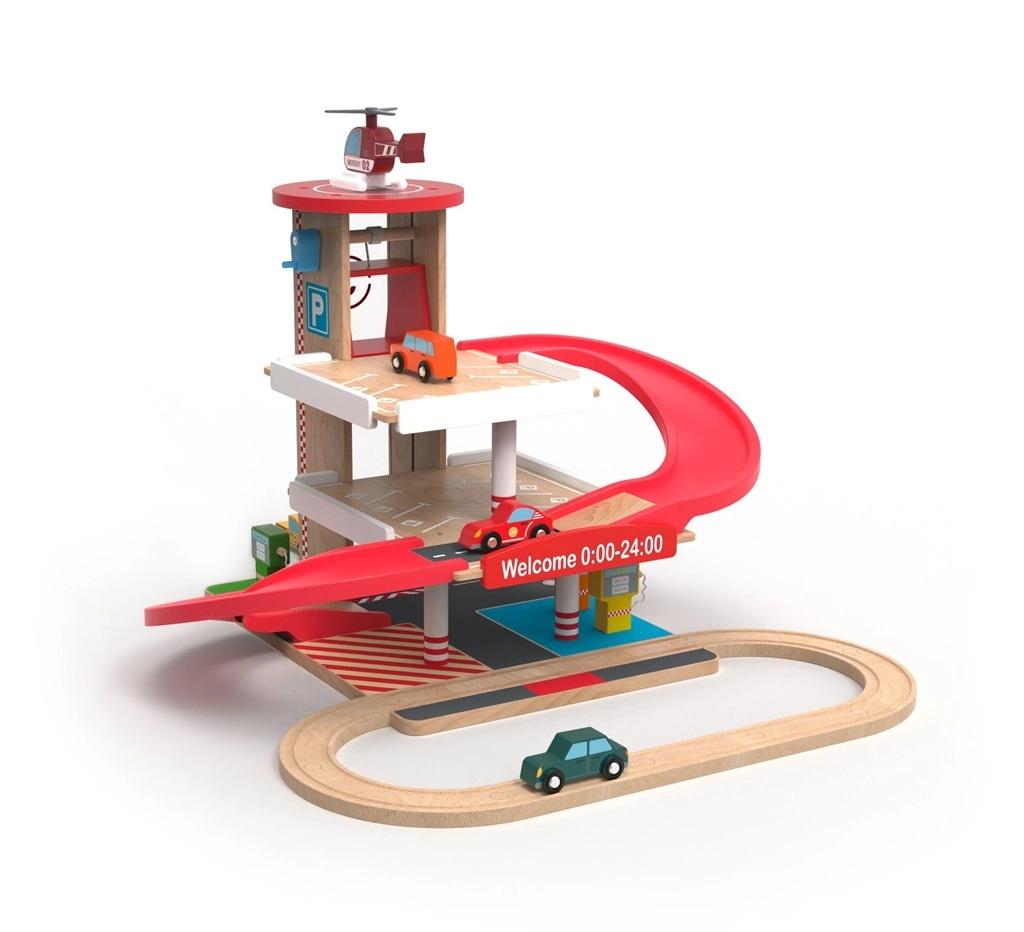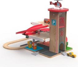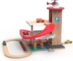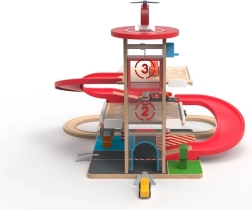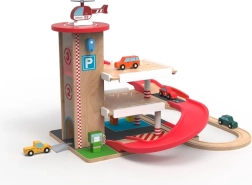 Šī kvalitatīvā koka garāža ar vilciena trasi piedāvā trīs stāvus stāvēšanai, funkcionālu liftu ar kloķa piedziņu un heliportu uz jumta. Bērni var uzpildīt degvielu pirmajā stāvā, pacelt mašīnīti ar liftu un palaist to lejup pa sarkano spirālveida rampu atpakaļ uz leju, kur tā plūstoši turpina ceļu pa sliedēm. Izturīgi materiāli un pārdomātas detaļas garantē ilgu kalpošanas laiku un drošu rotaļu.