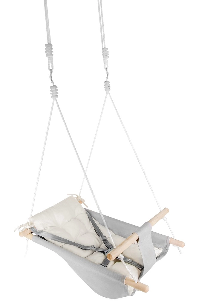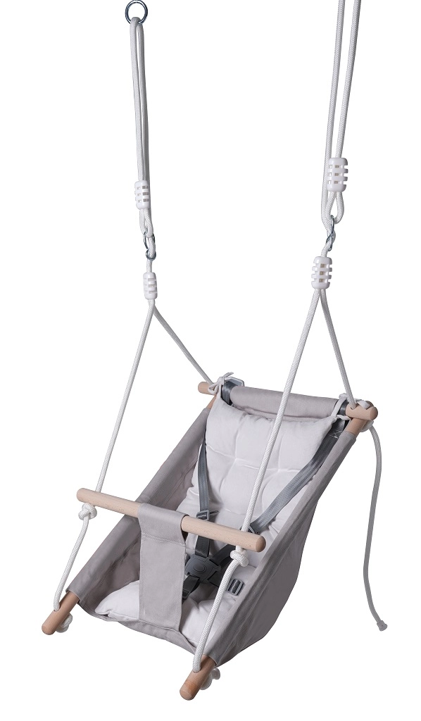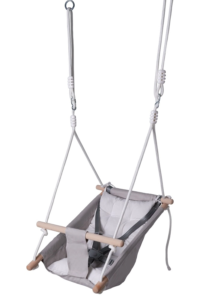 Pelēkā krāsa un vienkāršais izpildījums padara šūpoles ne tikai par rotaļlietu, bet arī par stilīgu bērnistabas akcentu.