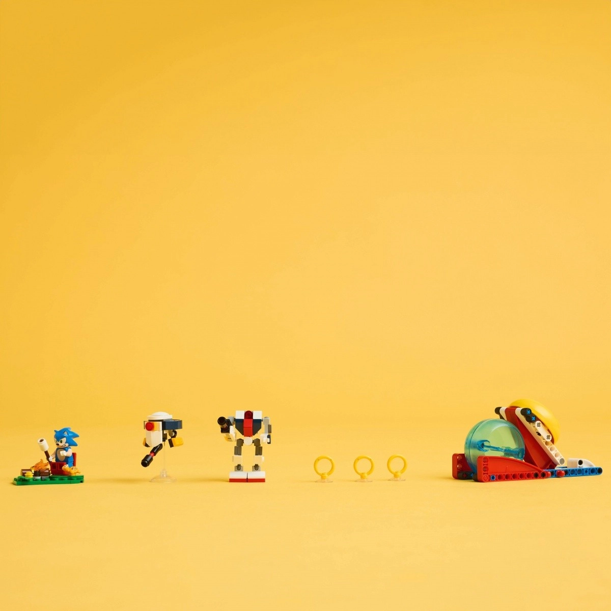 Stājieties pretī naidīgiem robotiem un izdzīvojiet piedzīvojumus ar leģendāro Soniku. Komplektā ir ugunskurs, palaidējs, ātruma bumba un virkne piederumu, tostarp Haosa smaragds un trīs zelta gredzeni. Iekļautas arī četras figūras: Sonika minifigūra, “lidojošs” G.U.N. vaboļu robots, kustīgs G.U.N. mednieka robots un Tocky.