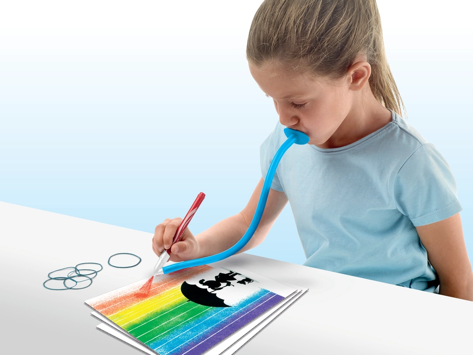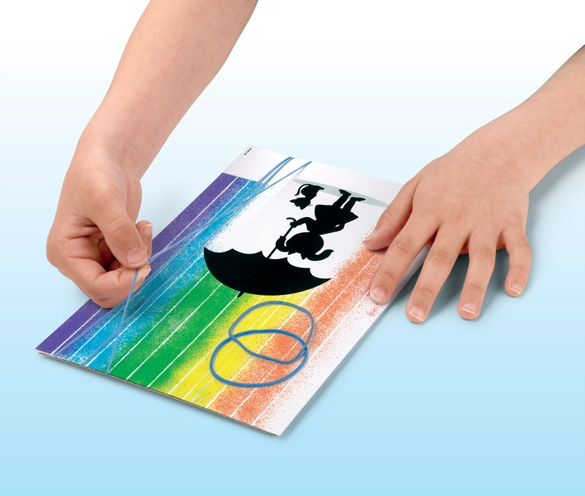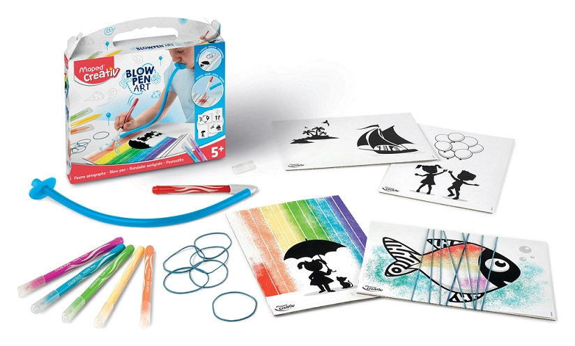 Maped pūšamo pildspalvu komplekts Blowpen String'Art pārvērš katru veidošanu par piedzīvojumu. Bērni vienkārši uzliek elastīgo uzgali, viegli iepūš flomāsterī un veido iespaidīgus krāsu pāreju un tekstūru efektus. Īpašās gumijas ļauj radīt oriģinālus string art efektus, kas izskatās kā no profesionālas darbnīcas.