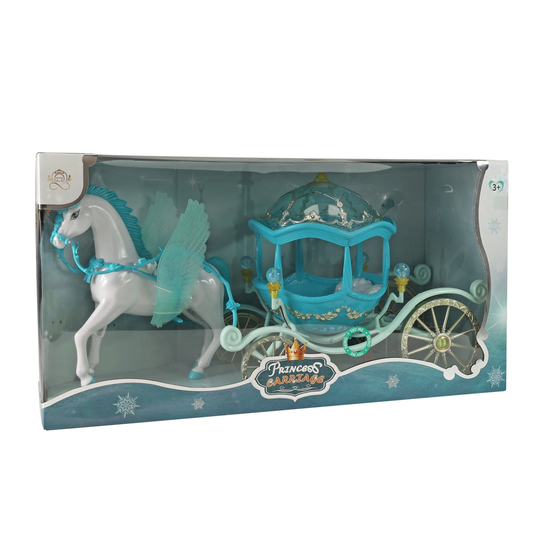 Iedarbini fantāziju ar šo burvīgo komplektu – pasaku karieti, ko velk spārnotais zirgs ar gaismas efektiem. Ideāli radošām spēlēm un leļlu karaliskajiem bailēm. Iepakojumā iekļautas 3× AG13 baterijas, kopējais komplekta garums ir aptuveni 60 cm.