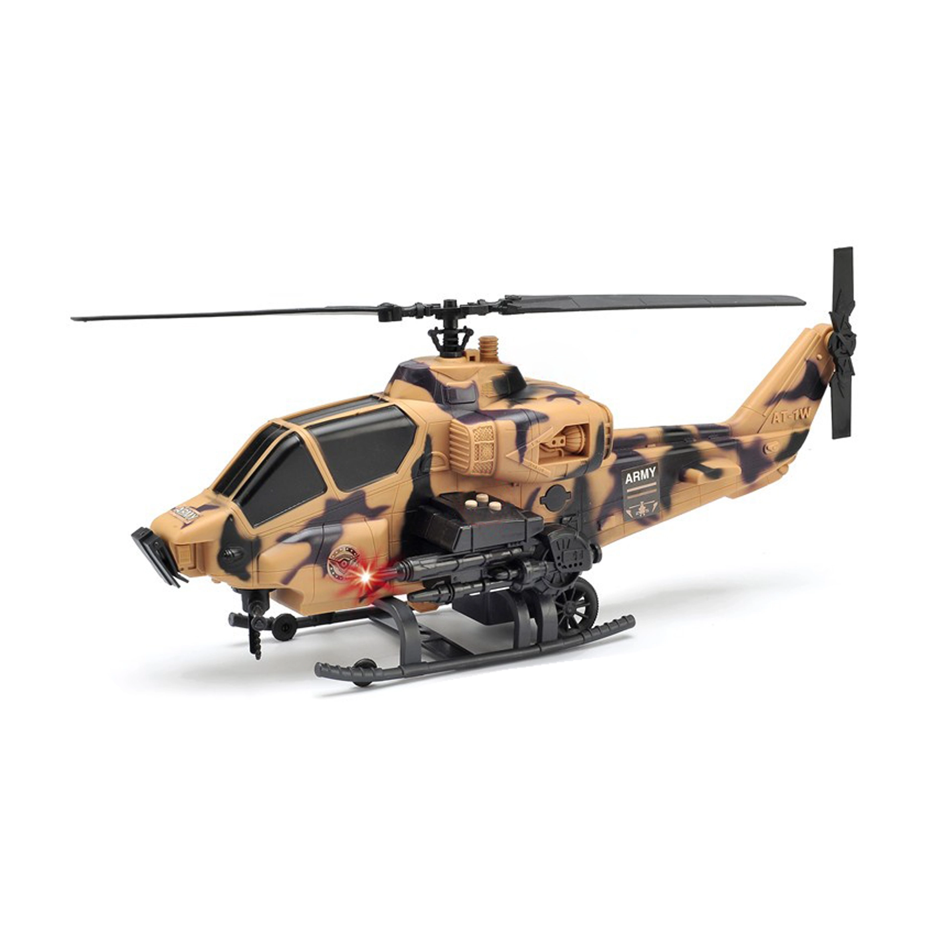 Liels armijas helikopters (42 cm) ar gaismas un skaņas efektiem, kas aktivizējami ar pogām. LR44 baterijas ir iepakojumā, tāpēc varat sākt spēlēt uzreiz.