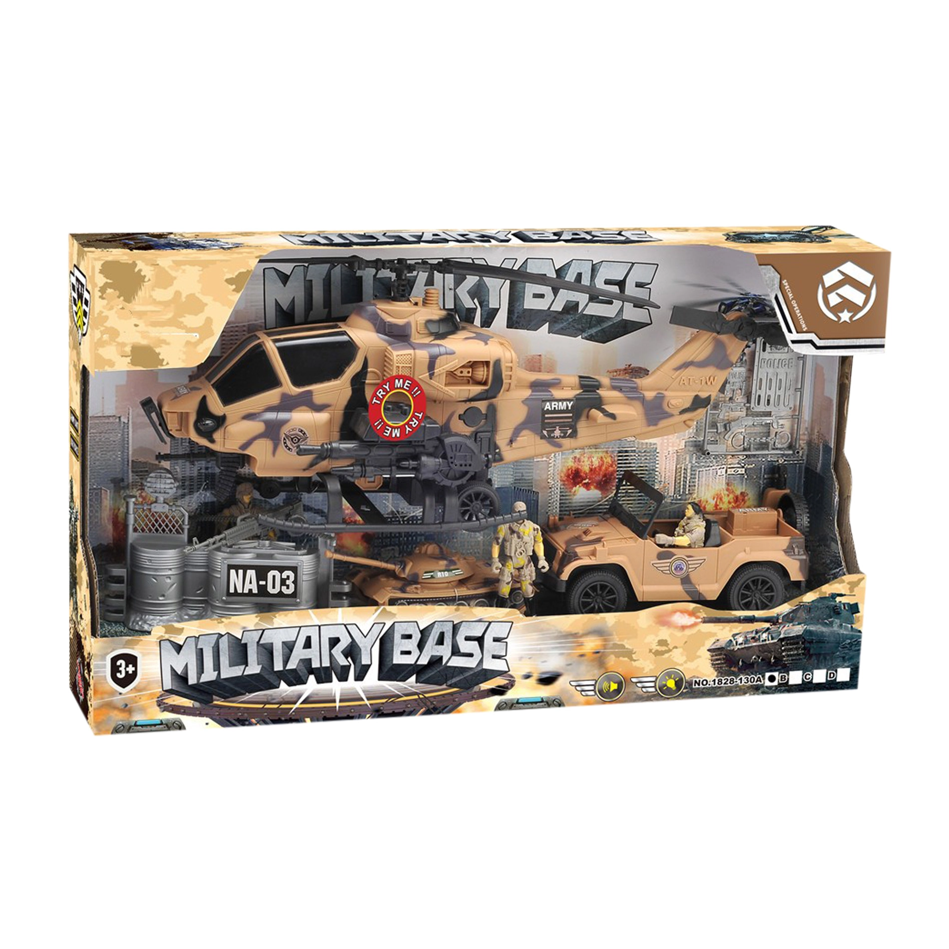 Atklājiet darbības pilnu militāro misiju pasauli ar detalizētu komplektu, kas attīsta iztēli un veicina radošu spēli. Komplekta centrā ir izturīgs helikopters ar funkcionālu gaismu un skaņu, ko papildina džips ar brīvgaitu, tanks un karavīru figūriņas ar aprīkojumu.
