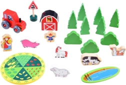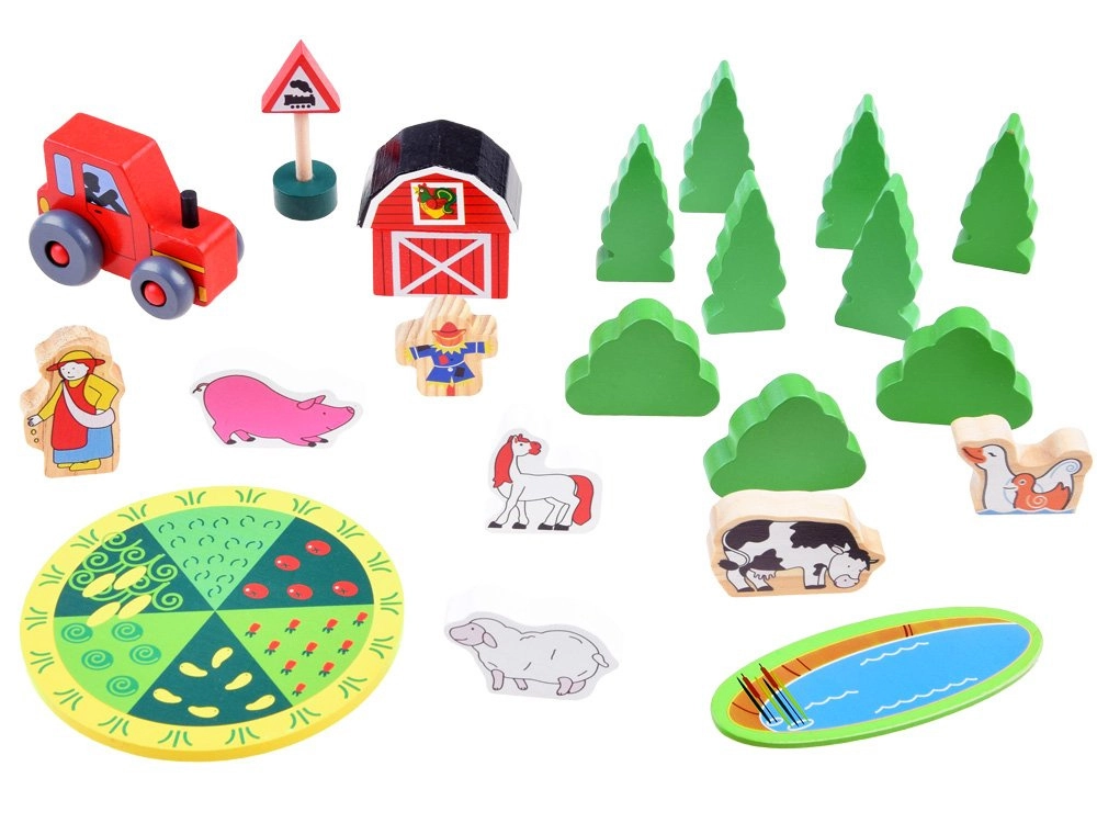 Komplektā ir autentiski lauksaimniecības elementi, piemēram, šķūnis, traktors un dažādas dzīvnieku figūriņas, kas ļauj bērniem radīt savu fermas pasauli.