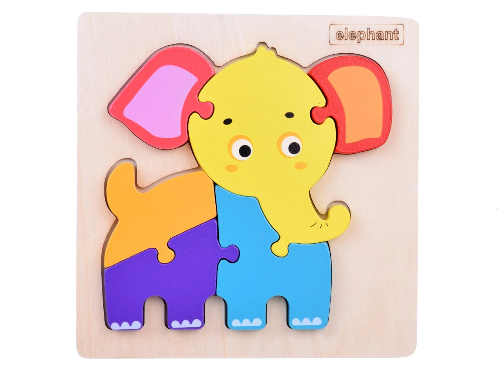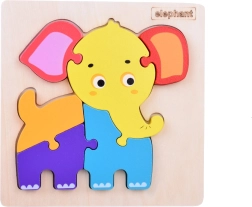 Sešas lielākas detaļas un koka pamatne ar ziloņa siluetu atvieglo pareizu ielikšanu un rada bērnam pārliecību rotaļājoties.