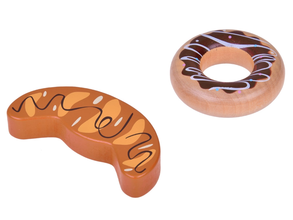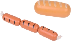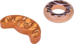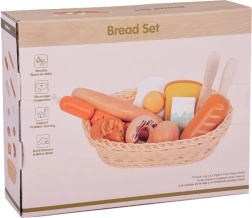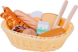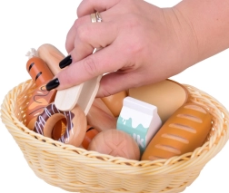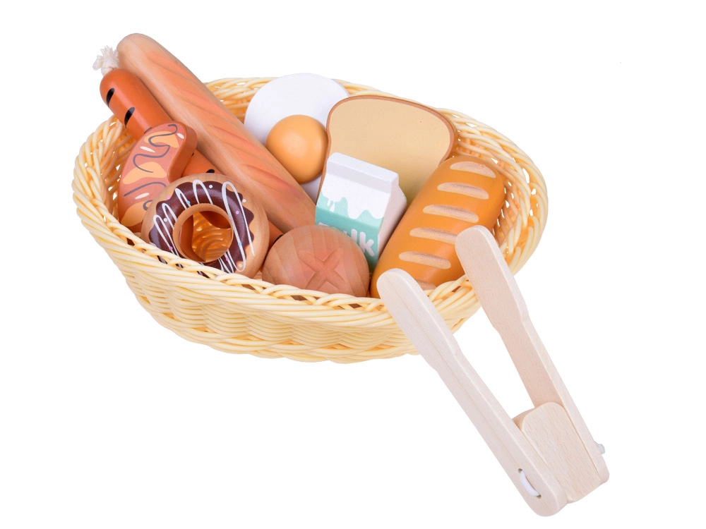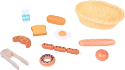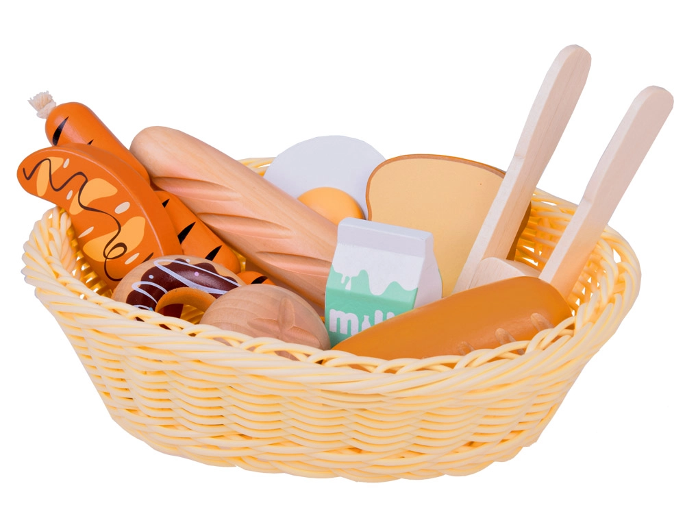 Bagetīte, baltmaizes bulciņa, tosts, kruasāns, virtuļi, desiņas, ola un piens – ticamas formas un krāsas aicina spēlēties virtuvē vai veikaliņā.