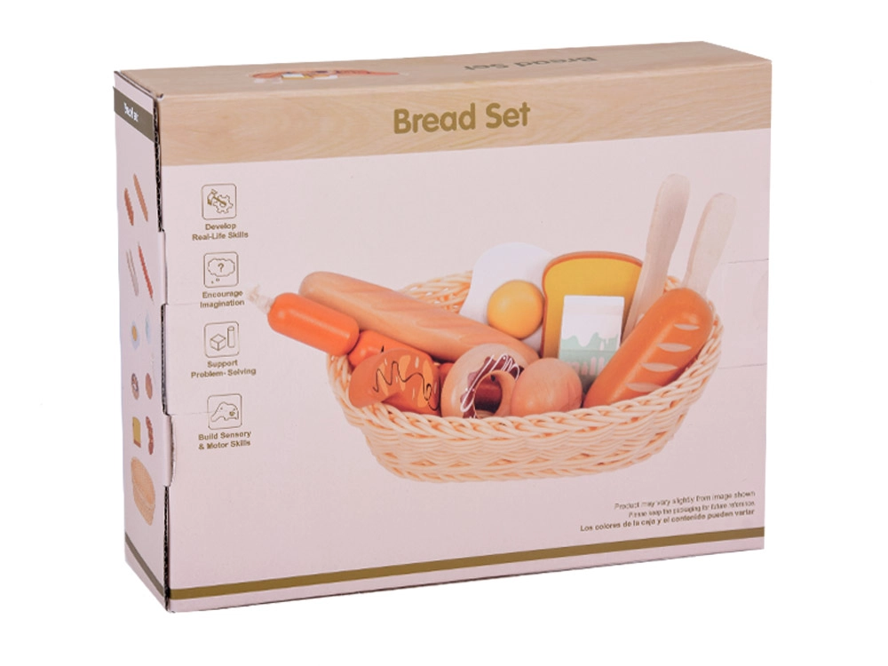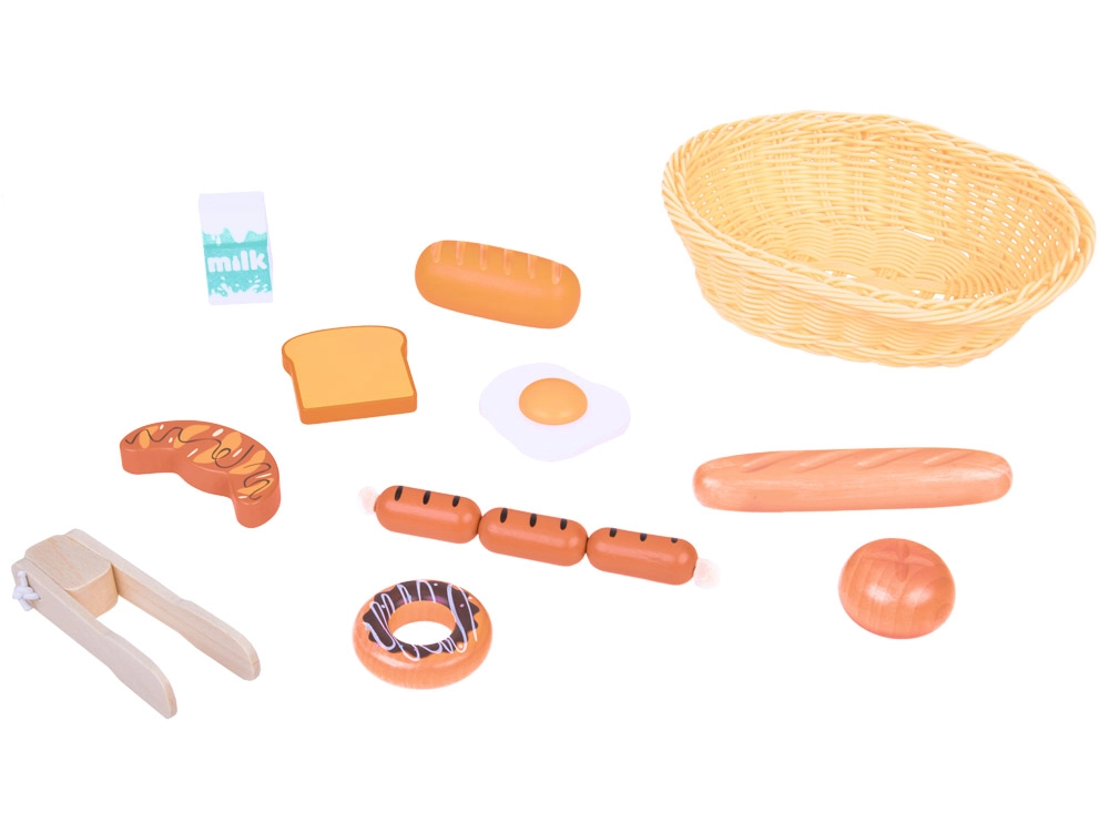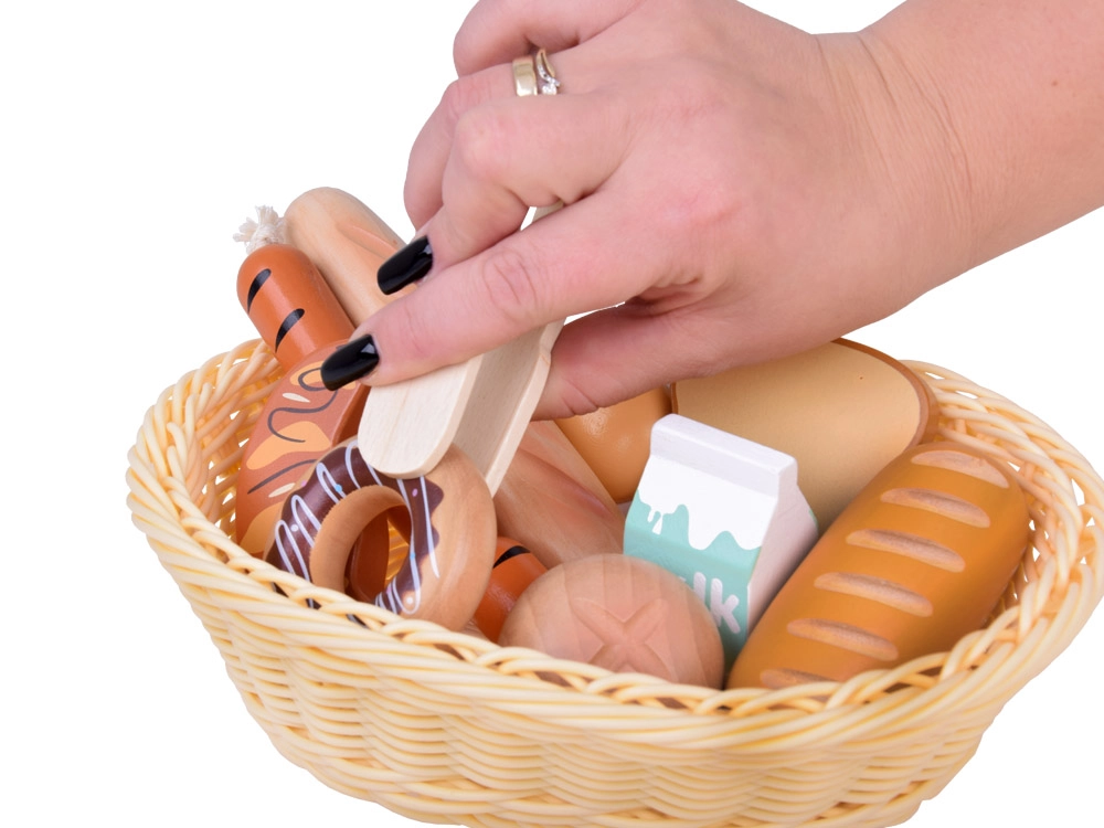 Šis burvīgais komplekts spēlei “veikals un virtuve” piedāvā daudzveidīgu koka pārtikas produktu izvēli: maiznīcas izstrādājumus (bagetīte, bulciņa, tosts, virtuļi), olu, desiņas un piena paku. Katrs gabals ir precīzi izstrādāts, gluds pieskārienam un krāsots ar netoksiskām krāsām, tāpēc tas ir saudzīgs bērniem un planētai. Komplektā ietilpst arī pīts groziņš un koka kniebkluču šķērītes servēšanai.