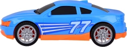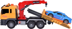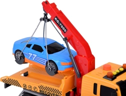Komplektā iekļauts arī zils sporta auto, kas ideāli der evakuatoram. Visa rotaļlieta ir izpildīta reālistiskās krāsās — dzeltenā, pelēkā, sarkanā un zilā.