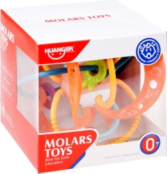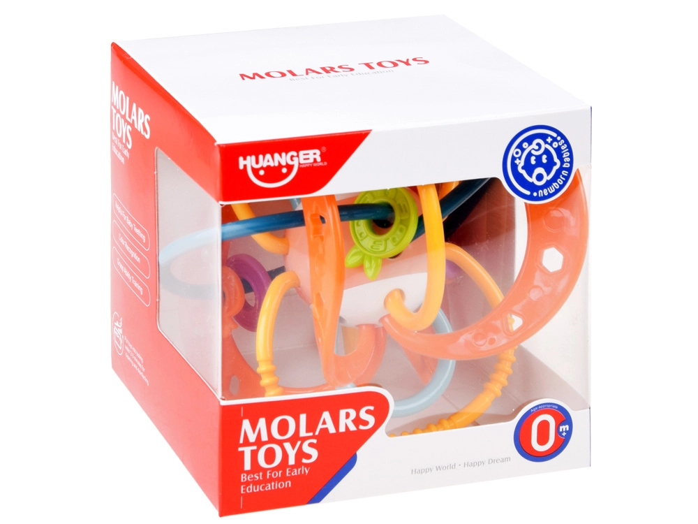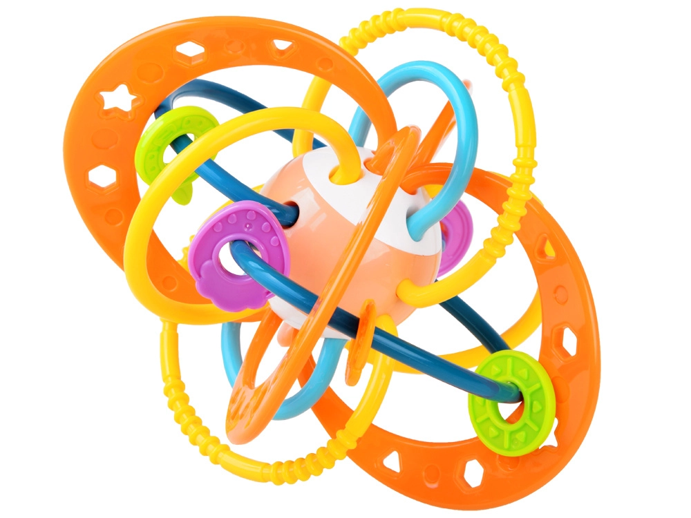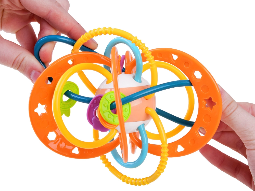 Viegla un droša sensorā košļājamā rotaļlieta ar savstarpēji savītām krāsainām cilpām attīsta sīkās motorikas prasmes, nomierina zobu šķilšanās laikā un mudina izpētīt dažādas tekstūras un formas. Visas malas ir noapaļotas, un materiāli ir droši bērniem no 0 mēnešiem.