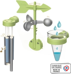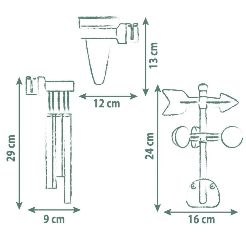 Pārveidojiet bērnu mājiņu par mazu meteoroloģisko staciju. Šis aizraujošais mācību komplekts veicina zinātkāri un praktiskās iemaņas – bērni var novērot vēja virzienu un ātrumu, mērīt nokrišņus un vienlaikus sajust apkārtējo pasauli, klausoties maigajās vēja zvanu skaņās.