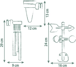 - Vēja rādītājs/anemometrs, nokrišņu mērierīce, vēja zvans