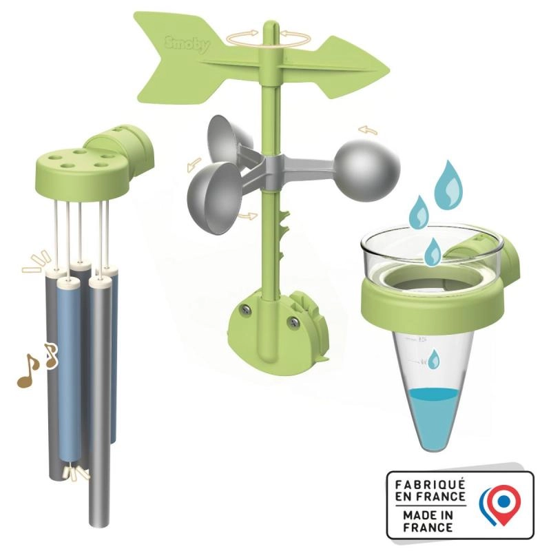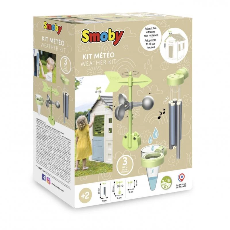 Atklājiet laikapstākļus tieši dārzā ar SMOBY mājiņu komplektu. Bērni jautrā veidā iepazīs zinātni, izmantojot vēja rādītāju/anemometru, nokrišņu mērierīci un vēja zvanu. Komplekts ir saderīgs ar visām SMOBY mājiņām, to ir viegli piestiprināt, un tas ir izgatavots no UV izturīgas plastmasas, kas lieliski pretojas laikapstākļiem un neizbalē.