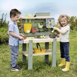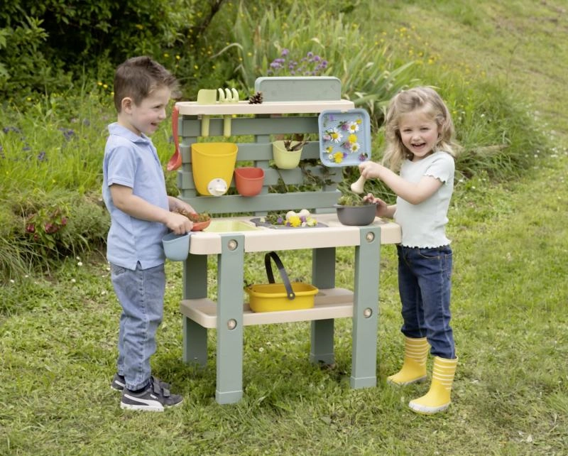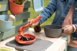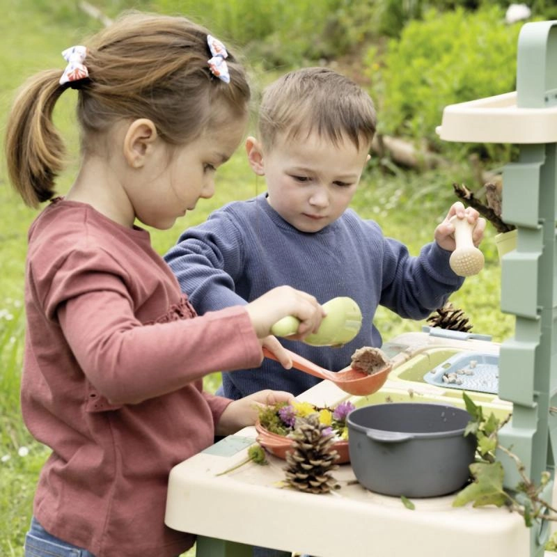 Šī izturīgā āra virtuve dabiskās krāsās bērniem piedāvā autentisku vietu rotaļām un eksperimentiem ar ūdeni, smiltīm un dabas materiāliem. Izņemamie konteineri atvieglo lietošanu un uzkopšanu, savukārt jaucējkrāns ar grozāmu aizdares mehānismu palīdz dozēt ūdeni un attīsta smalko motoriku.