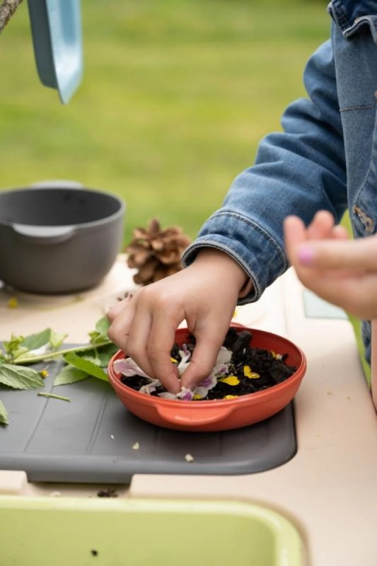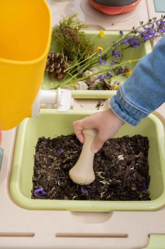 Siets, groziņš, kausiņš, grābeklis, lāpstiņa un citi piederumi iedvesmo “gatavot” no dubļiem, smiltīm un ziediem, kā arī veicina kopīgu rotaļu.