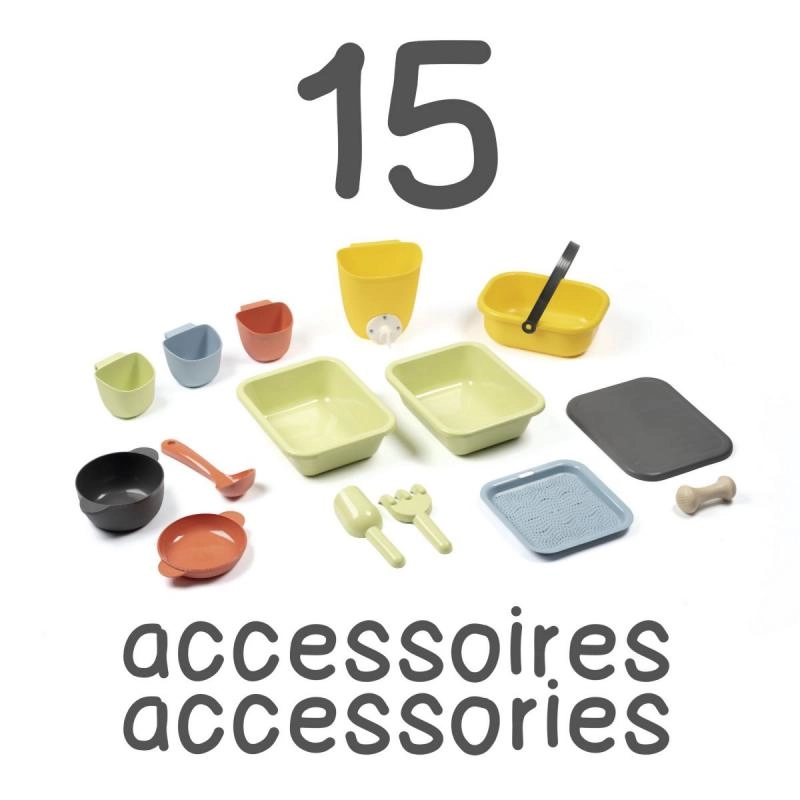 Komplektā ietilpst 15 praktiski piederumi (siets, groziņš, kausiņš, grābeklis, lāpstiņa u.c.), atbalsta virsmas, āķi un tvertnes vāks “dārgumu” slēpšanai un glabāšanai. Konstrukcija no kvalitatīvas plastmasas ar UV aizsardzību ir krāsnoturīga un piemērota lietošanai ārā.