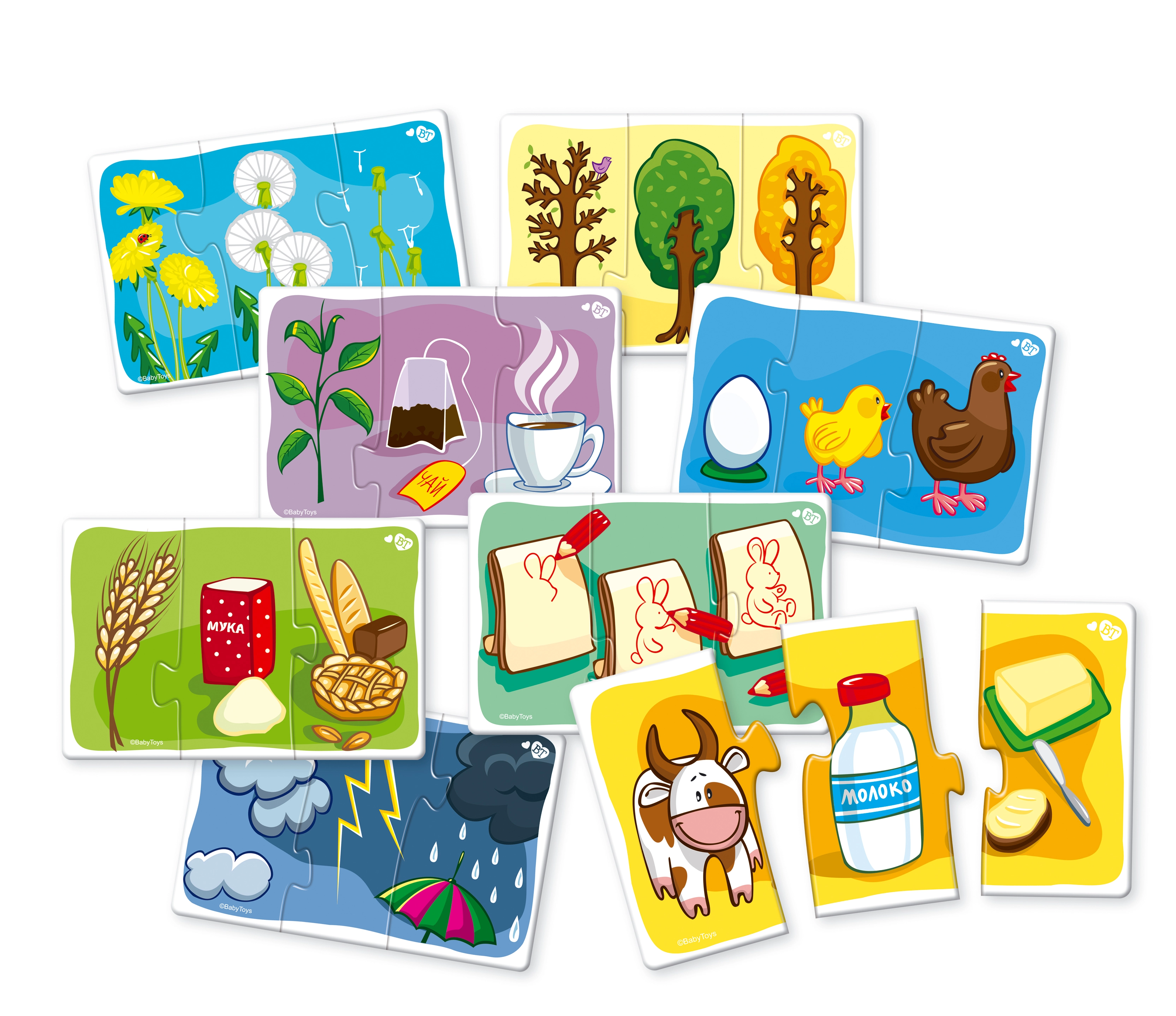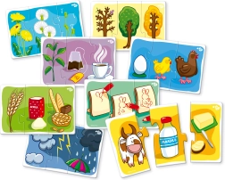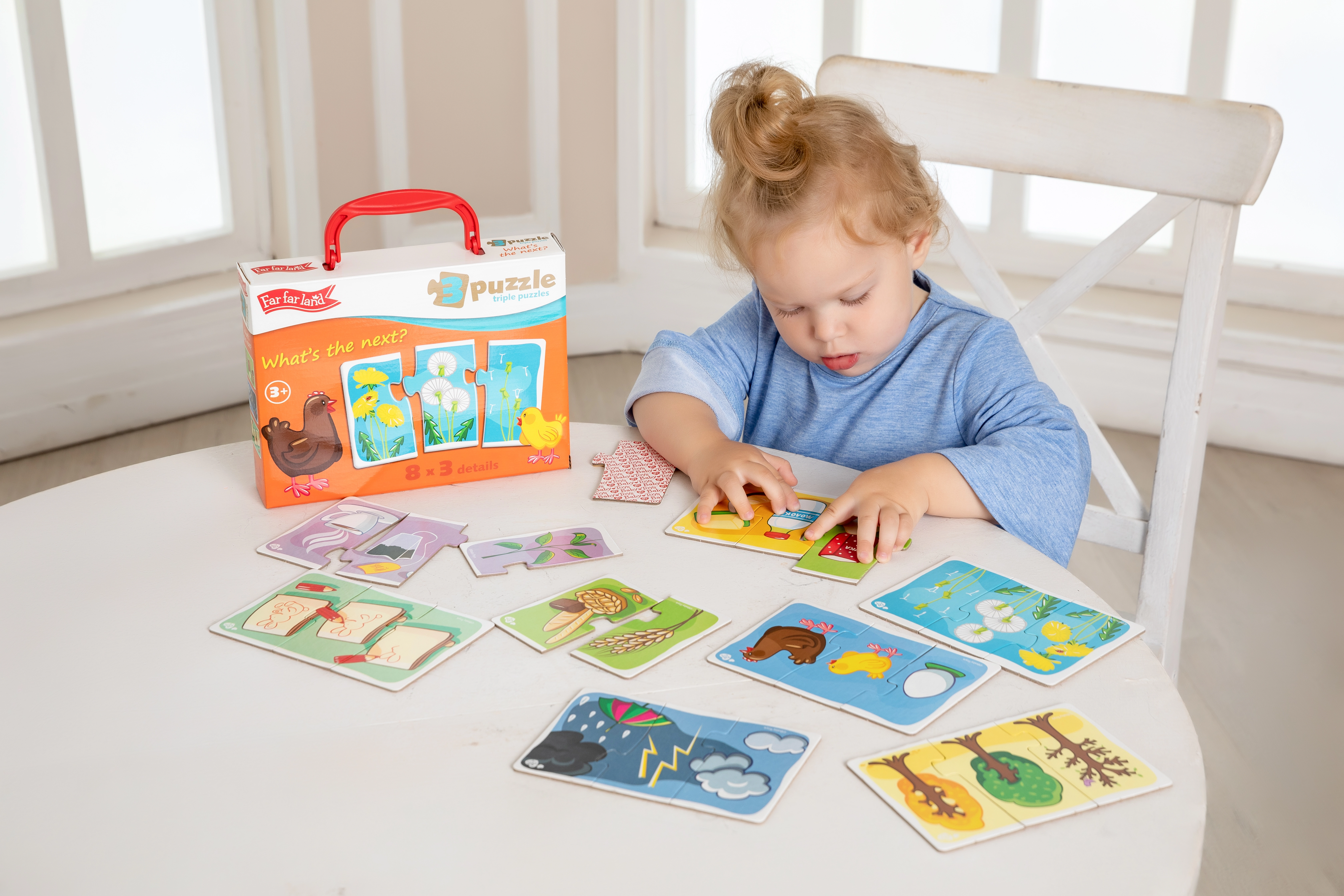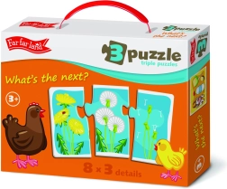 Far Far Land puzles trijnieki piedāvā aizraujošu un izglītojošu nodarbi bērniem. Katra iepakojuma saturā ir 8 unikāli puzles attēli, kas sastāv no trim gabaliņiem un attēlo priekšmetus, kas pieder vienai kopai.