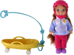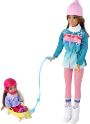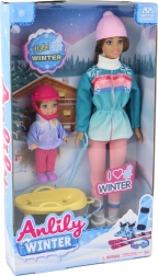 Atklājiet ziemas burvību ar mammu un meitiņu uz ragaviņām. Lielajai lellei ir gari brūni mati un silta cepure, mazā lellīte valkā rozā ķiveri drošākai spēlei. Pasteļtoņu ziemas tērpi ar sniegpārsliņām izceļ sniegoto piedzīvojumu noskaņu, bet dzeltenās ragavas aicina uz bezgalīgu braucienu.